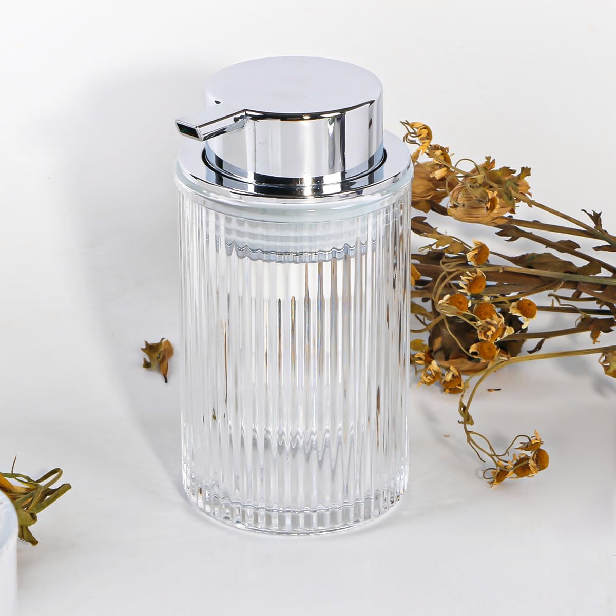 Clear Foaming Soap Dispenser, 12 Oz Glass Foaming Hand Soap Dispenser with Silver Pump, Bathroom Refillable Liquid Lotion Container Pump Ribbed Bottle for Kitchen Bathroom Decor, 1pc