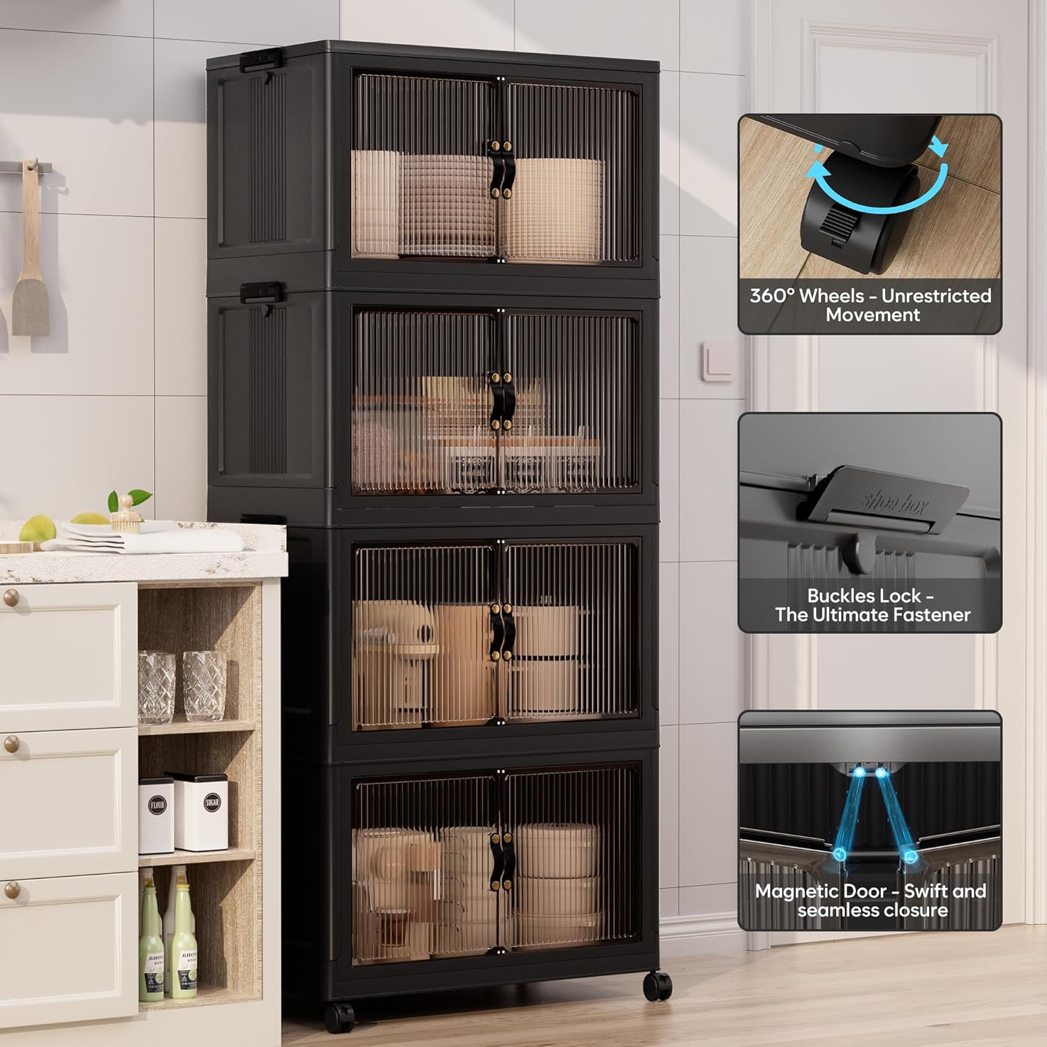 Jalove 50QT Plastic Storage Bins with lids, Stackable Collapsible Storage Containers with Wheels, Closet Organizer and Drawers, Clothes Storage Cabinet for Home Office Garage, 4 Pack Black