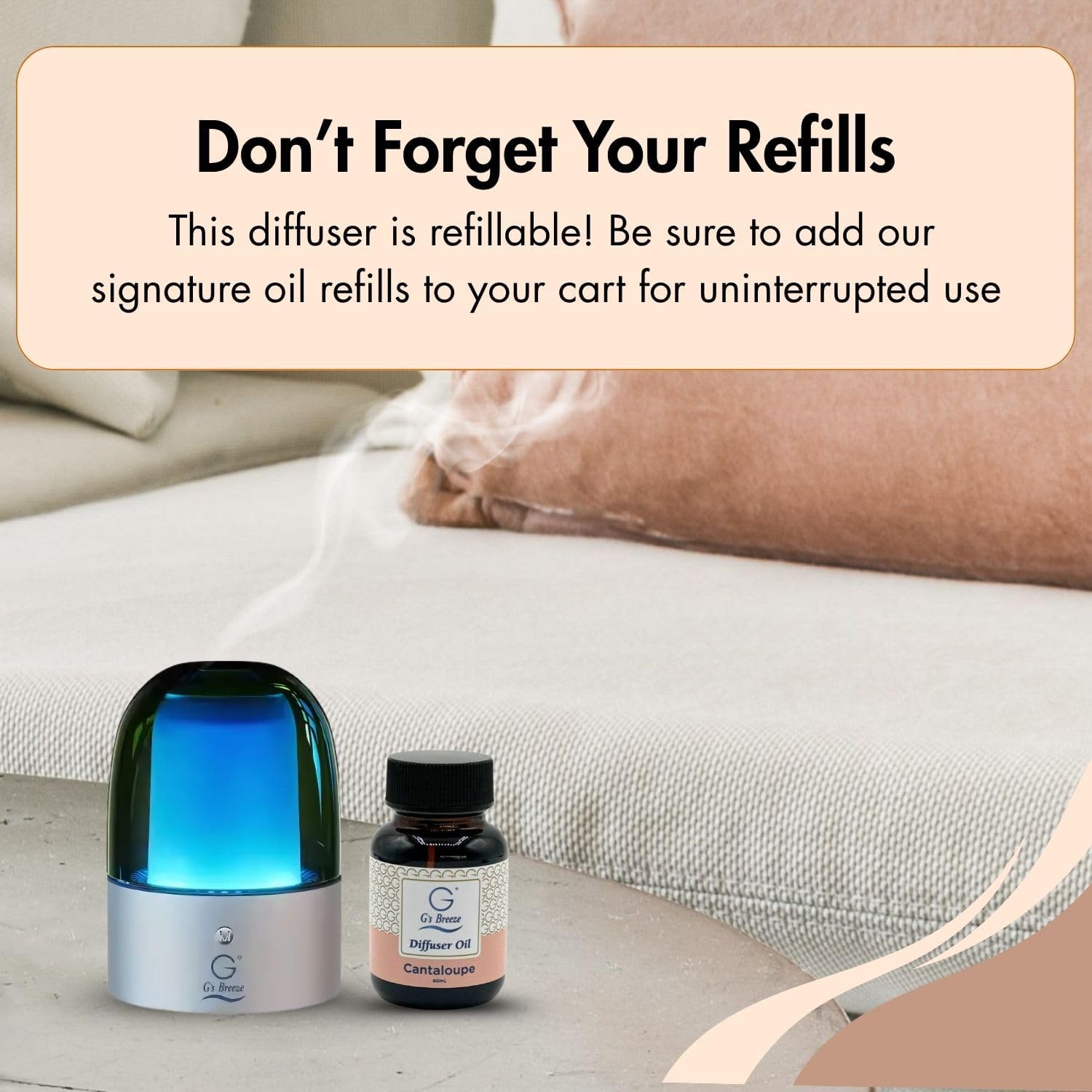 G's Breeze Cantaloupe Diffuser Oil Refill - Sweet, Refreshing & Juicy Scent of Ripe Cantaloupe - Uplifting Aroma, Fruity Spray for Home or Office - Energizing & Long-Lasting Fragrance - 60 ML