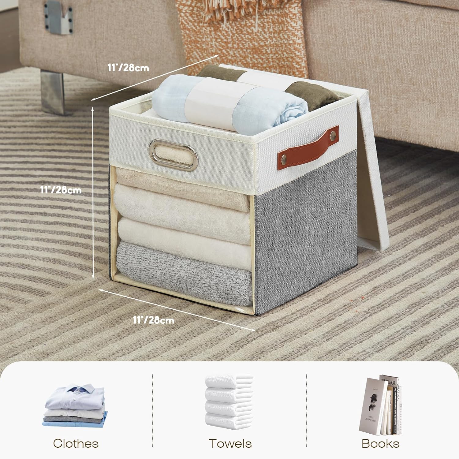 Fabric Storage Cubes with Clear Windows and Lids, 11'' Foldable Storage Bins with 3 Handles, Decorative Storage Boxes for Home, Bedroom, Closet, Office (Gray & White)