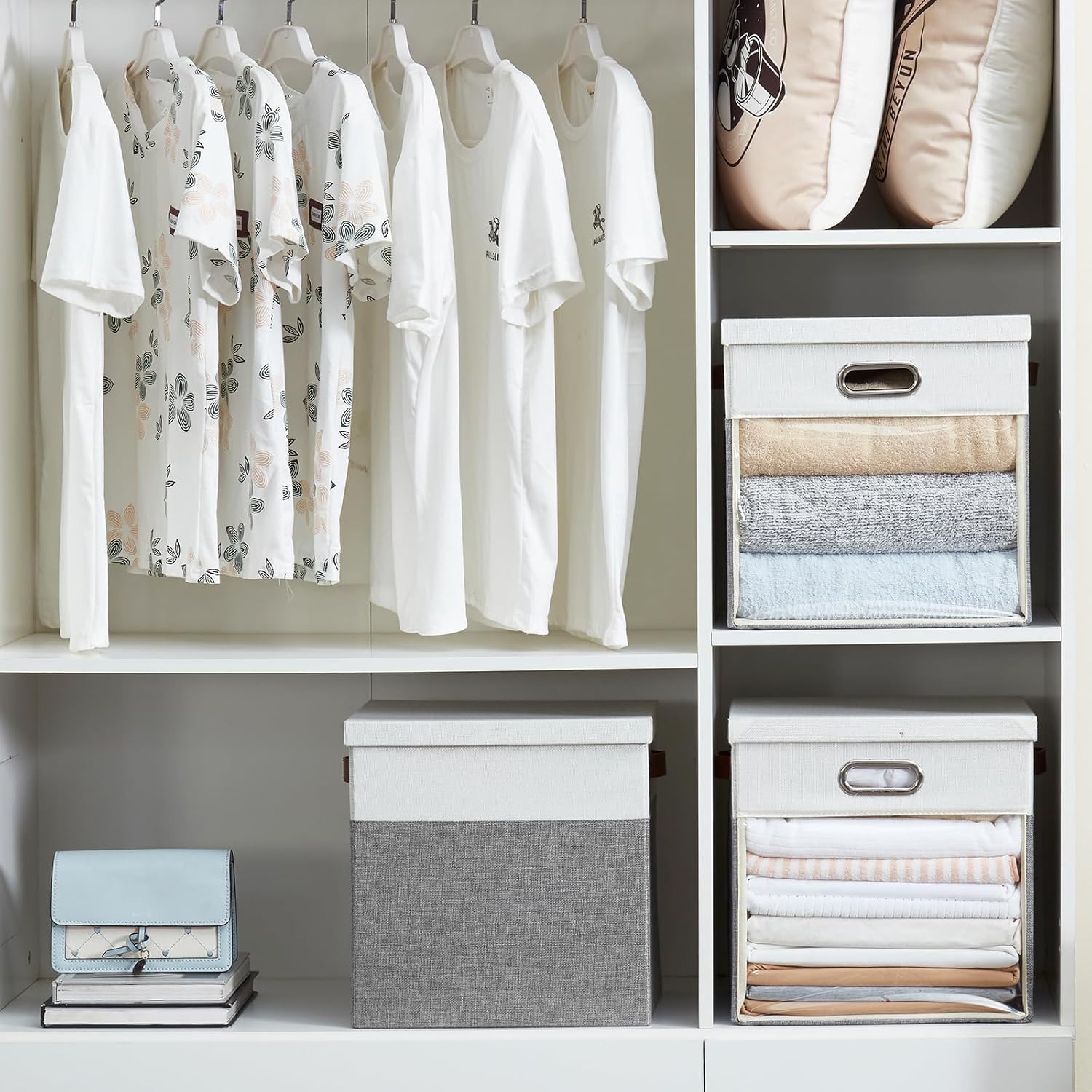 Fabric Storage Cubes with Clear Windows and Lids, 13'' Foldable Storage Bins with 3 Handles, Decorative Storage Boxes for Home, Bedroom, Closet, Office (Gray & White)