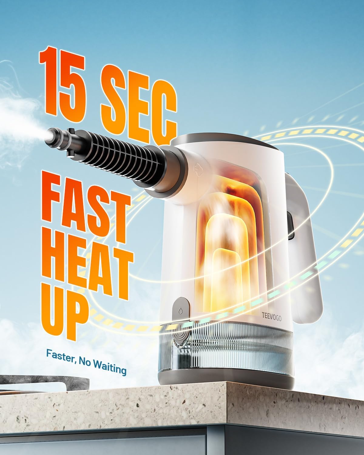 - Fast Heat-Up in 15 Seconds: The TEEVOGO handheld steam cleaner heats up in just 15 seconds, delivering 230°F high-temperature steam for immediate cleaning results. This hand held steam cleaner lets you skip the wait—just plug in and get powerful steam on demand with this professional steam cleaner for home