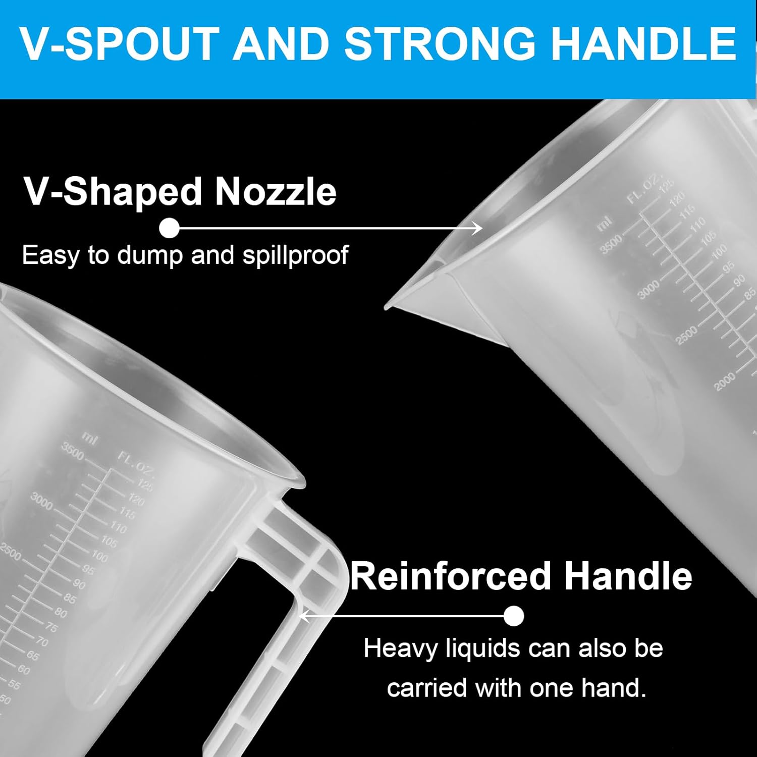 - V-SPOUT AND STRONG HANDLE -- Plastic graduated measuring pitcher V-spout is easy to dump and prevents leaks, waste and spills; The sturdy, chunky handle is easy to handle and can be carried with one hand even when the pitcher is filled with heavy liquid