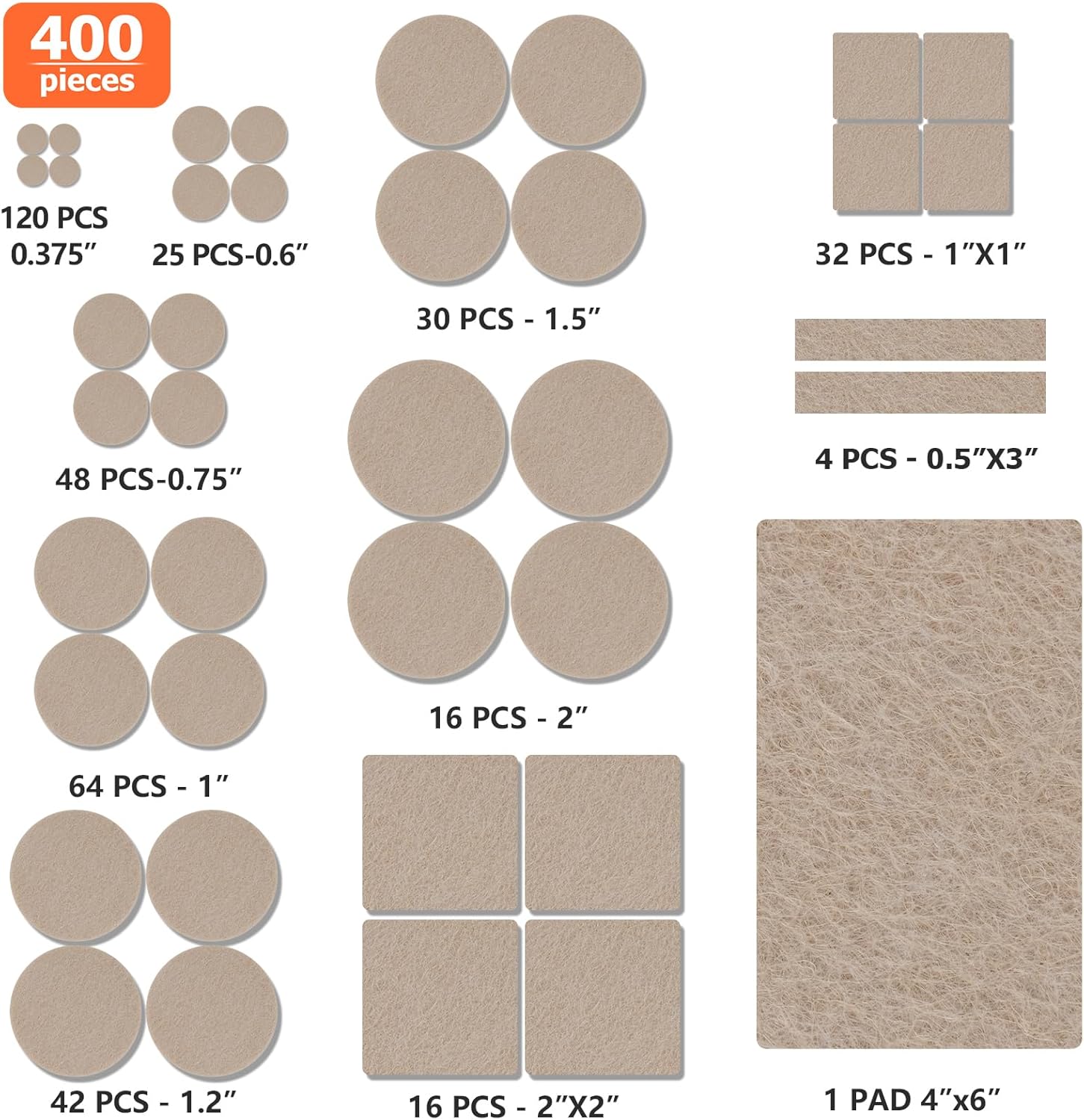 Felt Furniture Pads 400 Pieces, Furniture Pads for Hardwood Floors, Floor Protectors for Furniture Legs, Felt Pads for Furniture, Many Large Sizes Beige