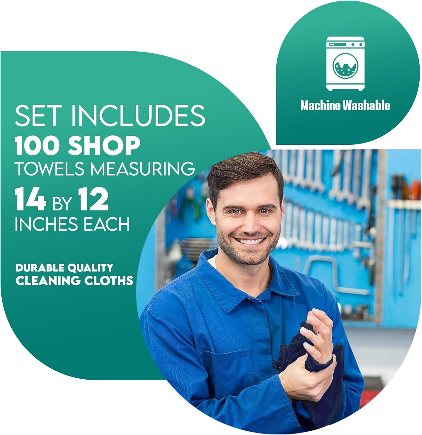 - Effortless Cleaning Power—Zuperia Shop towels include a Pack of 100 cotton shop towels measuring 14" x 12" Inches. They can quickly wipe away dirt, stains, and spills, effortlessly absorbing liquids, oils, and grease for efficient cleaning.