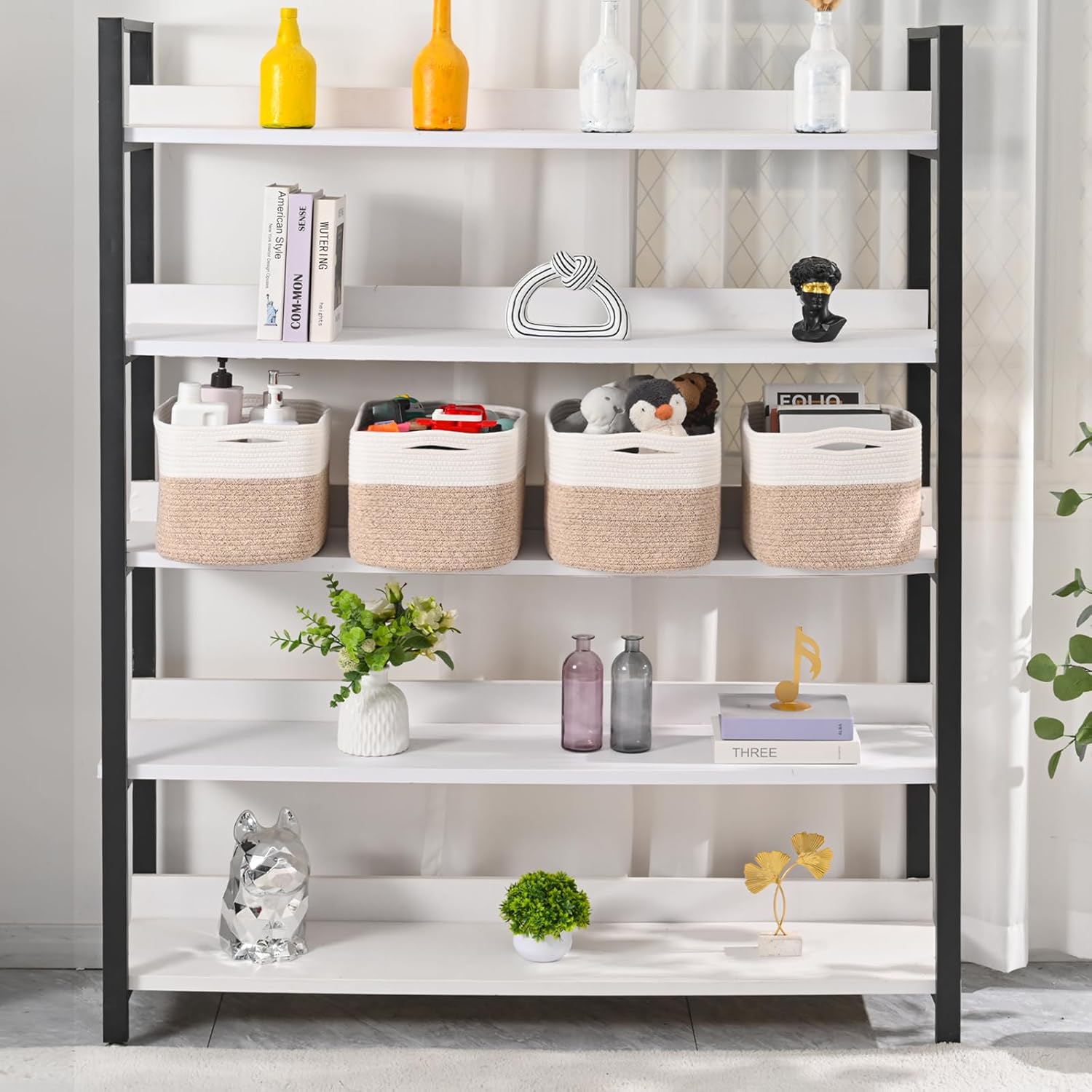 Storage Baskets for Organizing & Shelves, Woven Cotton Rope Organization Bins for Dog Toys, Clothes, Books, Nursery Organizer, 15" Lx11''Wx9.5''H, (4 Packs) Off White & Brown