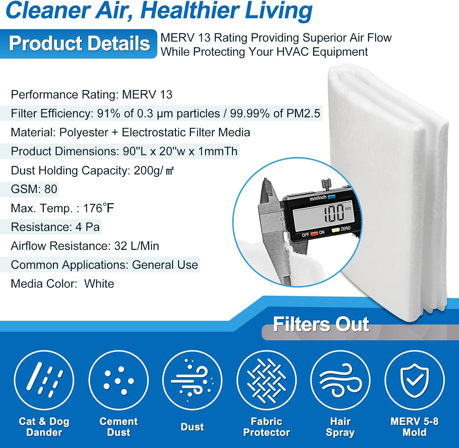 - Customizable Fit for Any Vent - You will get a full 12.5 Ft²(20x90 inch) of UCINNOVATE MERV 13 air filter filtration material. Ideal for any vent size, from standard AC grilles, RV ceilings, ceiling exhausts or furnace ducts. Highly recommended for dust control from your forced air vents on floors, ceilings, walls, windows, fan or furnace. UCINNOVATE MERV 13 filters deliver fresher, healthier air in your living space!