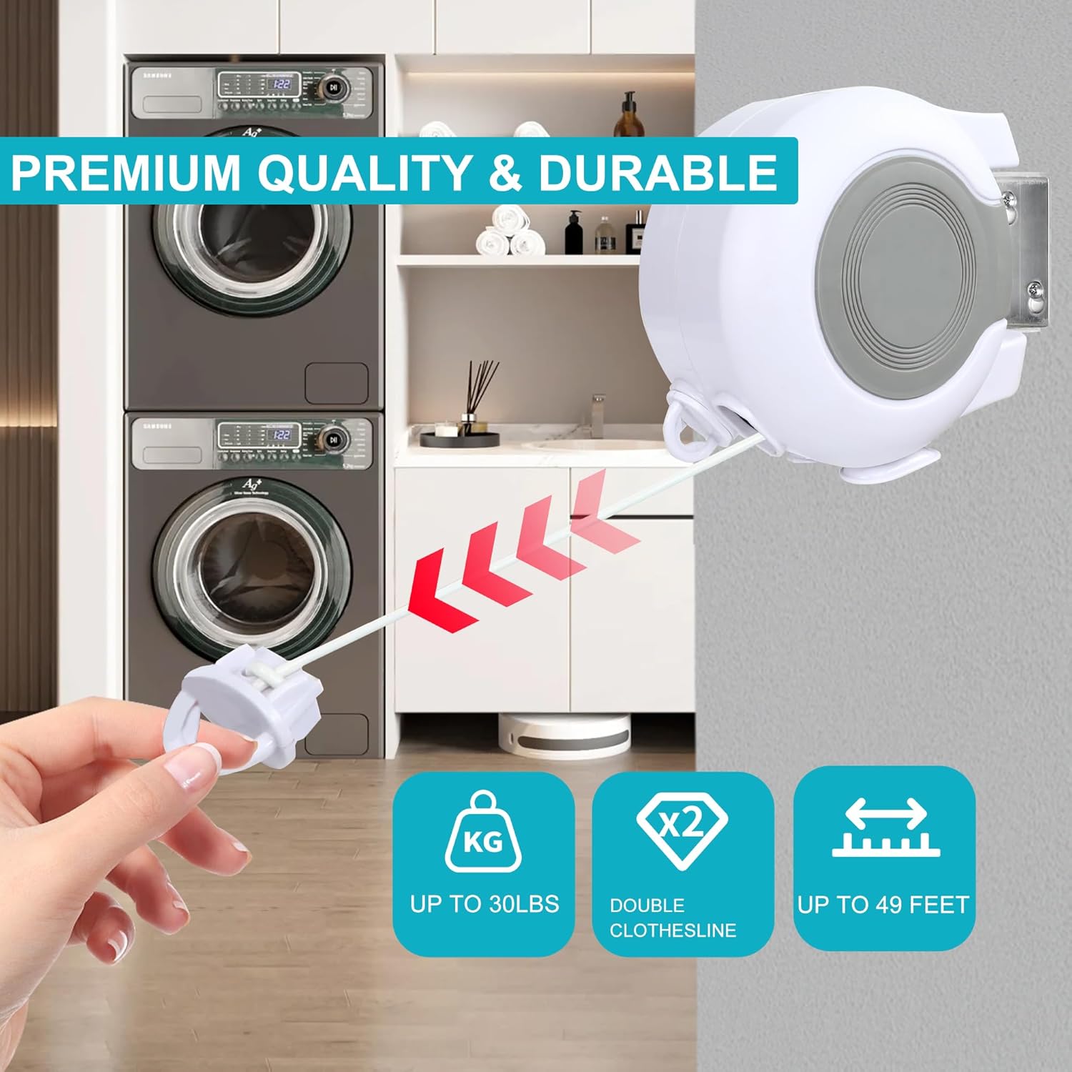 - PREMIMUM QUALITY: This rugged 30lb retractable clothesline comes fully assembled with ABS case that laughs at sun, rain, and drops β just mount it anywhere in seconds, stretch its 49ft muscle to hang king-size comforters or 20 soaking towels
