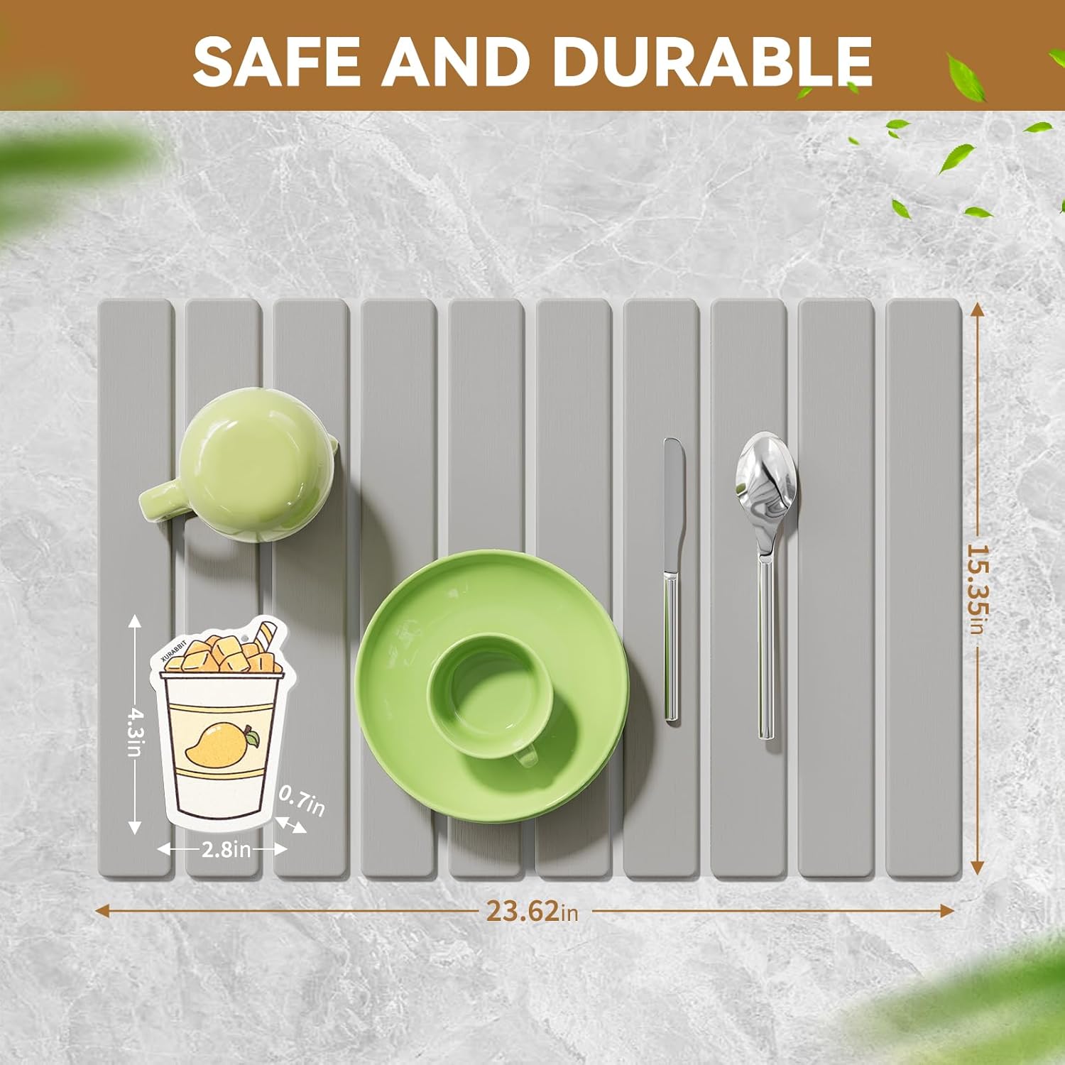 - Large Anti-Slip Stone Kitchen Mat:Measuring 23.6"x15.3", this stone-textured drying mat provides ample space for dishes with its non-slip mesh base. Includes sandpaper to maintain absorbency - the perfect stone kitchen drying mat for lasting performance!