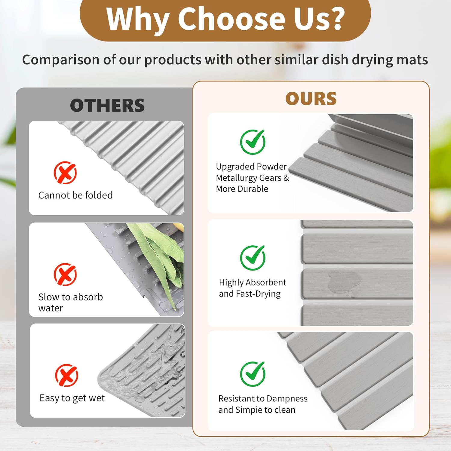- Natural Diatomaceous Earth Material:Made from premium, food-grade diatomaceous earth, this mat absorbs water instantly, keeping your countertops dry and clean. odor-resistant, and more durable than silicone or fabric mats—perfect for dishes, cups, and cookware. A must-have for a hygienic, clutter-free kitchen!