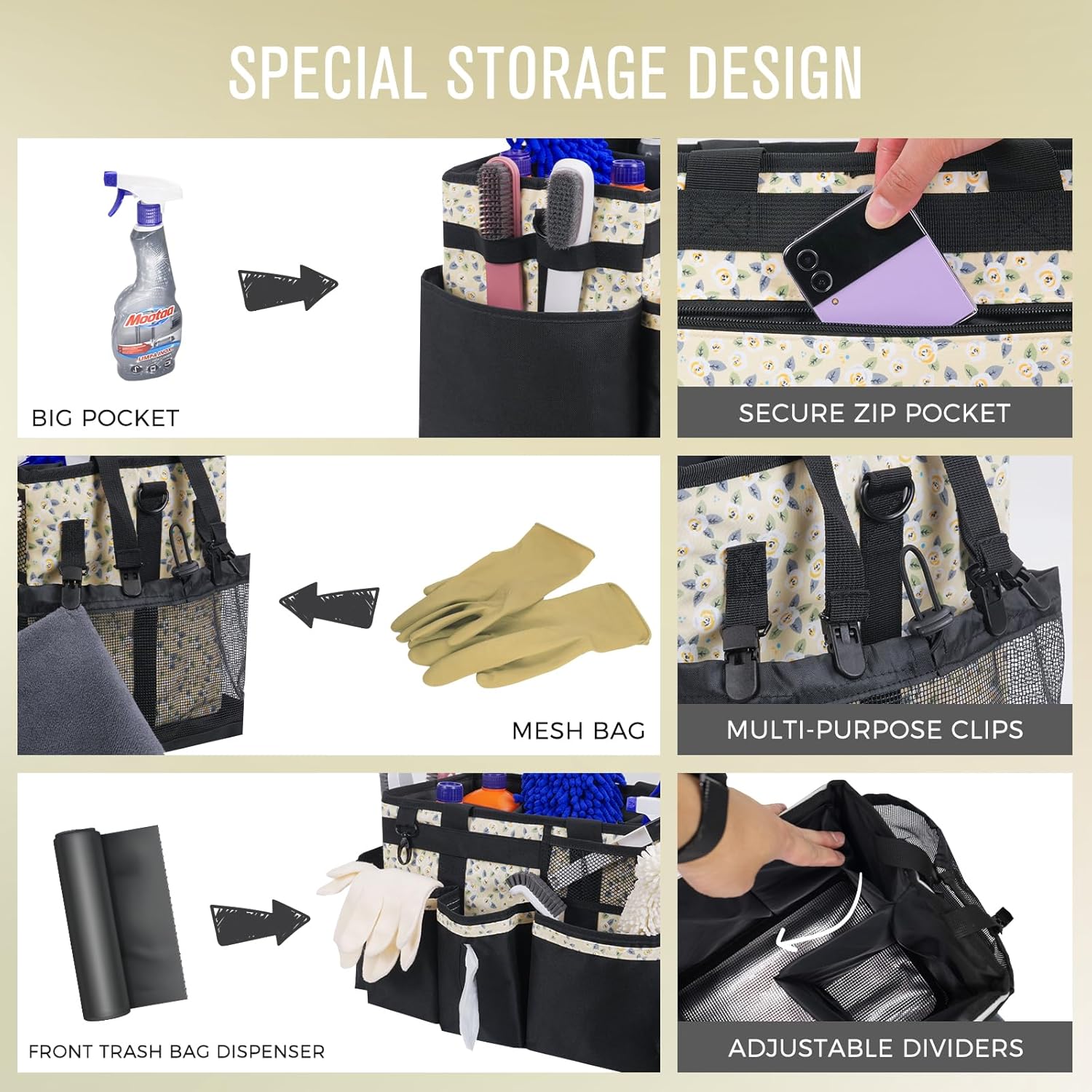 Wearable Cleaning Caddy, Cleaning Caddy Supplies Organizer with Handle & Shoulder Straps for Housekeepers, Under Sink & Car Cleaning Tool Organizers Bag with 4 Foldable Divider (YellowFlower)