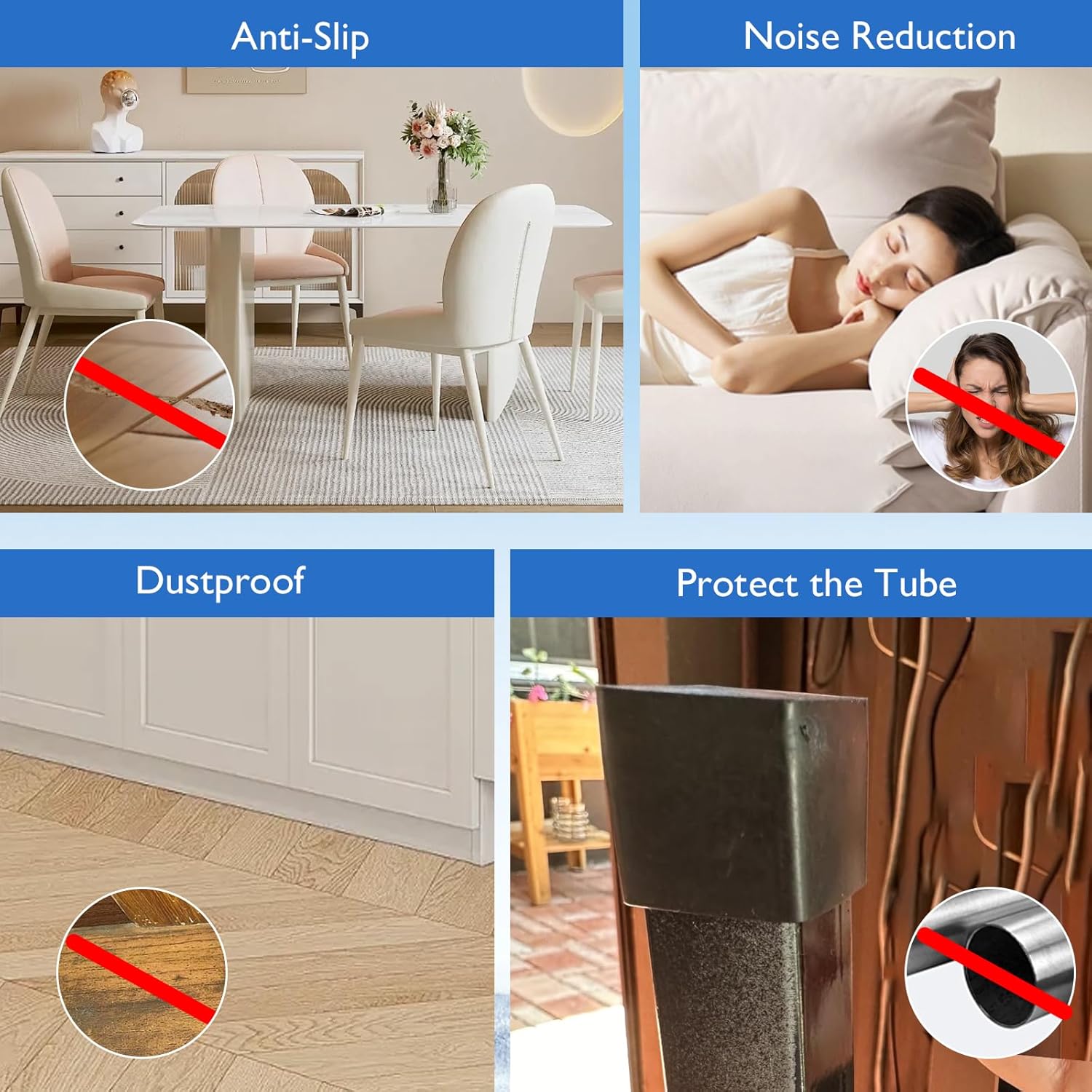 - Floors Protection & Noise Reduction: Our flexible chair leg covers feature a protective "glide" that prevents scuffs and marks caused by furniture movement; Plastic plug end caps silence sound, creating a quieter, more comfortable environment in your home or workplace; The soft yet durable material ensures wood, tile, pavers and natural flooring remain pristine while providing a seamless finish