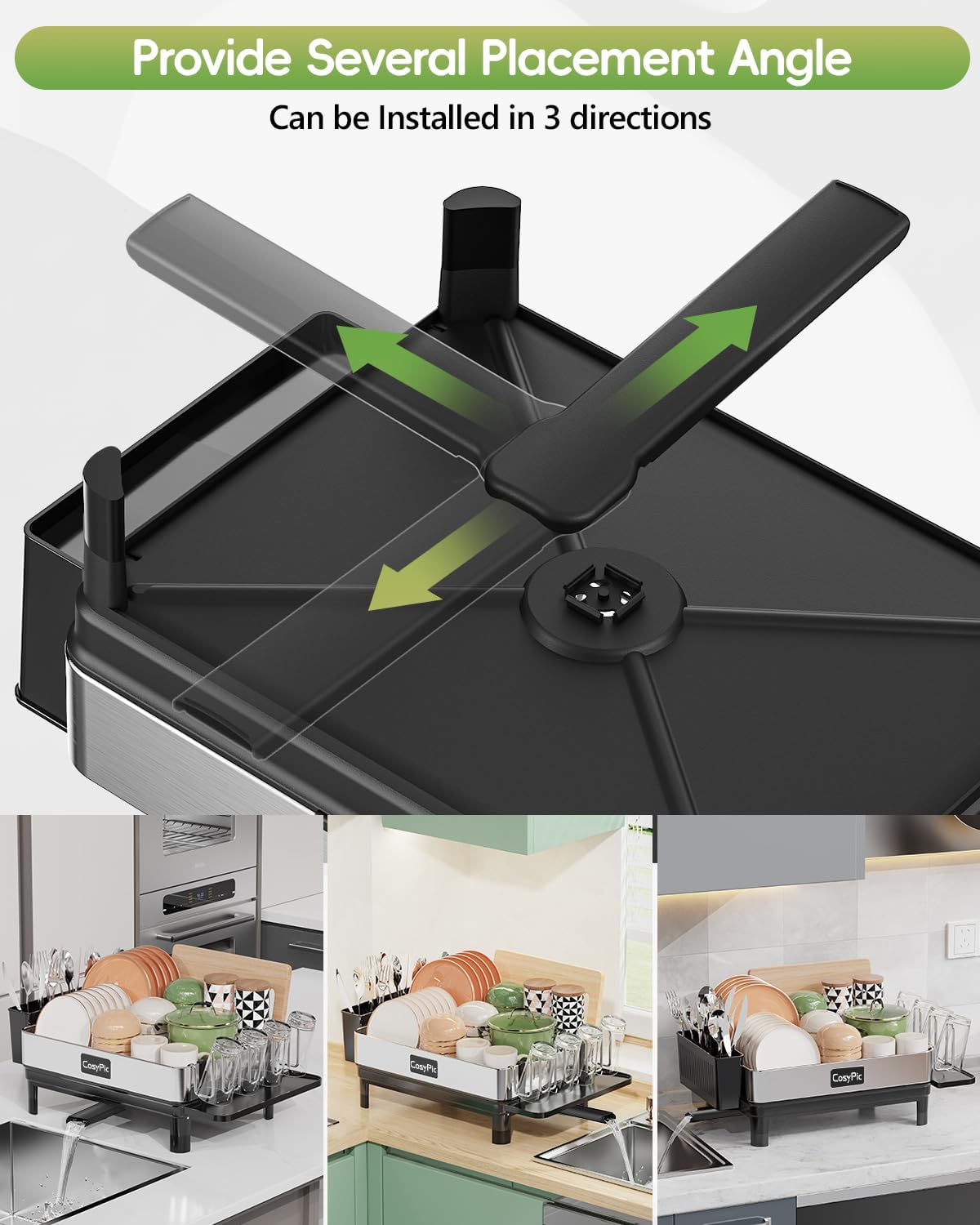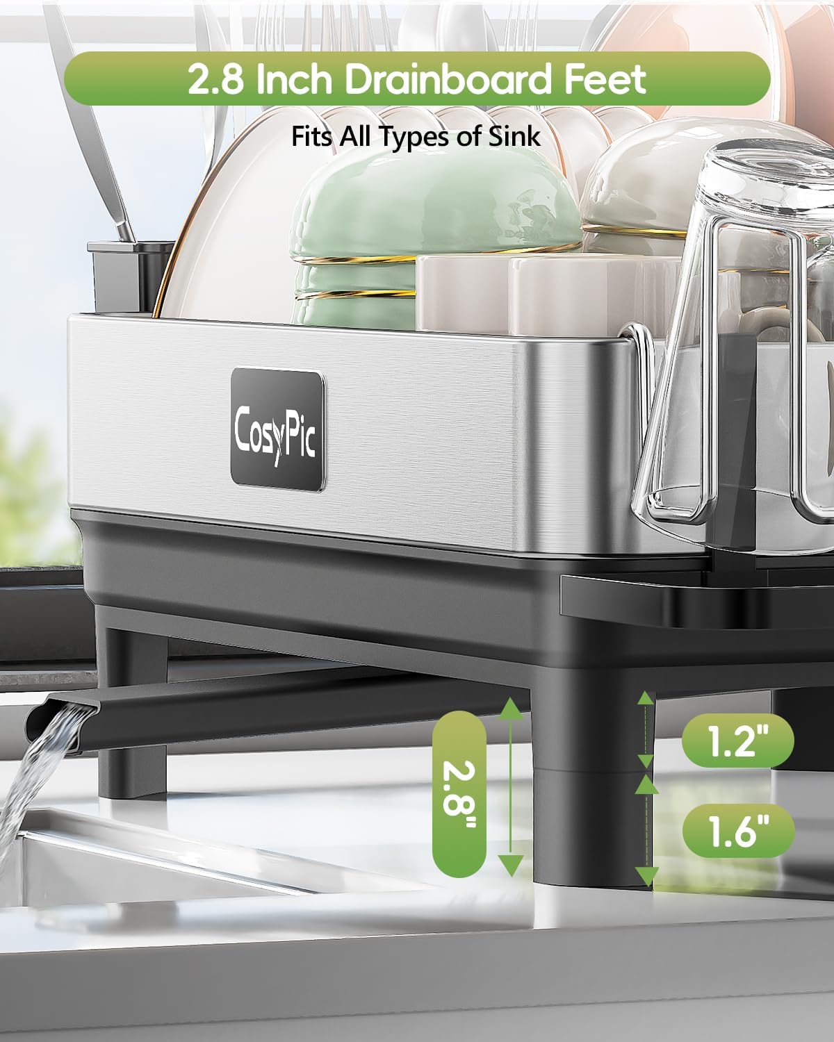 - 【Higher Feet Fits All Type of Sink】: CosyPic dish drainer for kitchen is equipped with 4 heightening pads to adapt to different sink types, which helps to divert water and avoid water accumulation on the kitchen countertop.