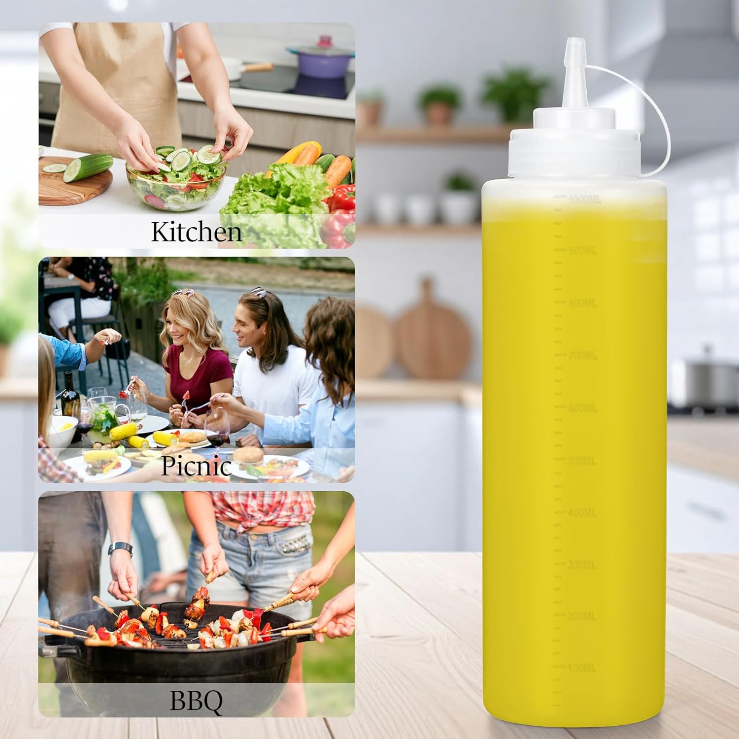 Condiment Squeeze Bottles Ketchup Dispenser, 6 Pack 32oz Squeeze Bottles for Liquids, Plastic Sauce Bottle with Cap Lid, Squirt Bottles for Sauces Liquids BBQ Dressing Pancake Art