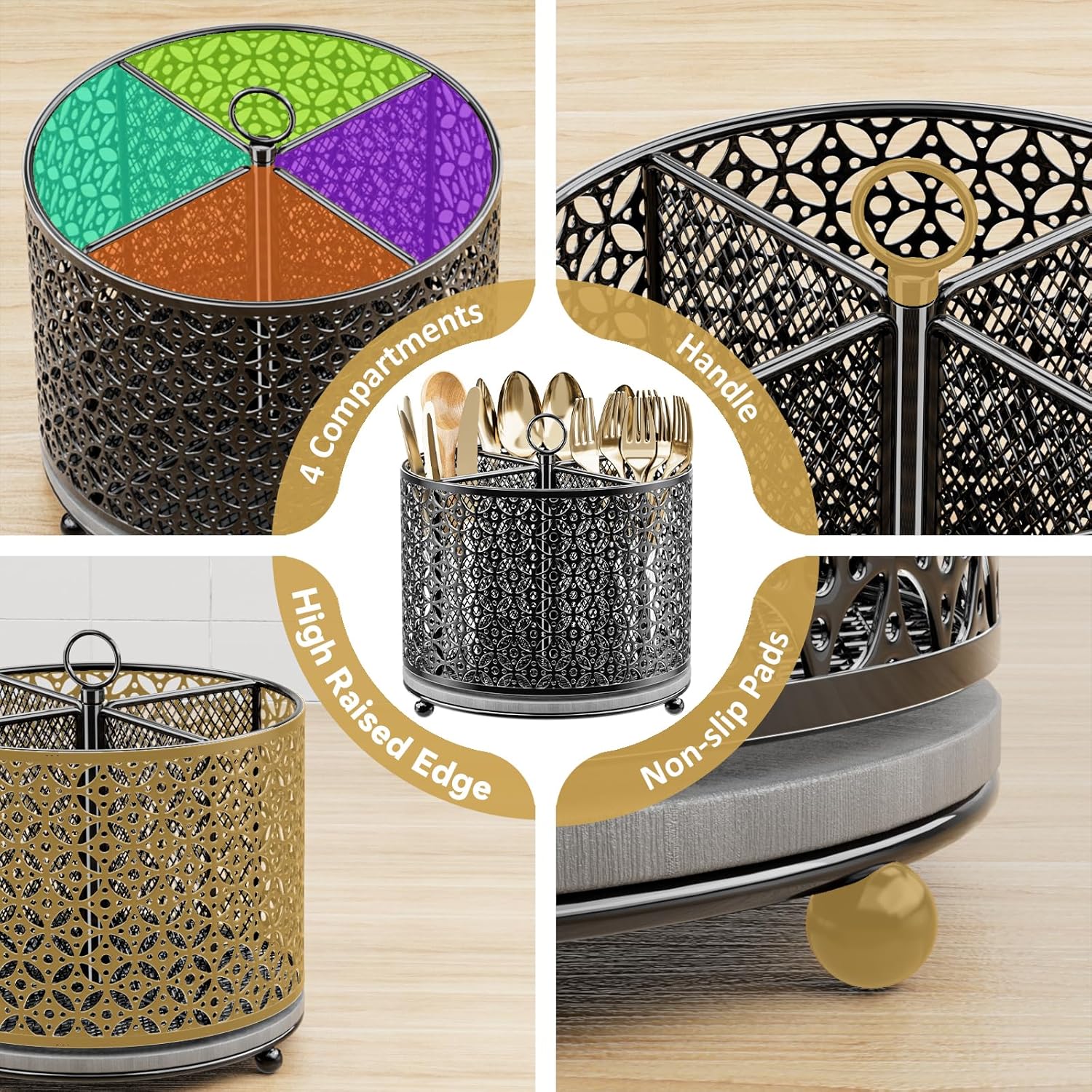 - Durable & Non-slip Counter Organizer: The cutlery holder is made of high-quality anti-rust and waterproof metal, sturdy and built to last.It is equipped with large base and 3 anti-slip rubber pieces to makes this spinning organizer more steady, firm and prevent scratching the kitchen counter surface or dining table. Handle ring on the top make it convenient to take it from one place to another
