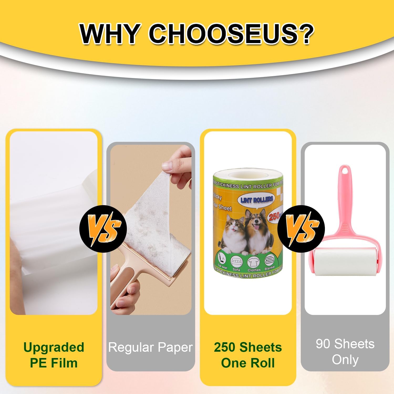- EASY TO PEEL & TEAR SHEETS: Each sheet is precision cut to ensure a clean, easy tear every time. Whether you go from the top or the bottom, easily peel each used sheet from the pet hair roller to reveal a new fresh sheet. One roller has 250 sheets.