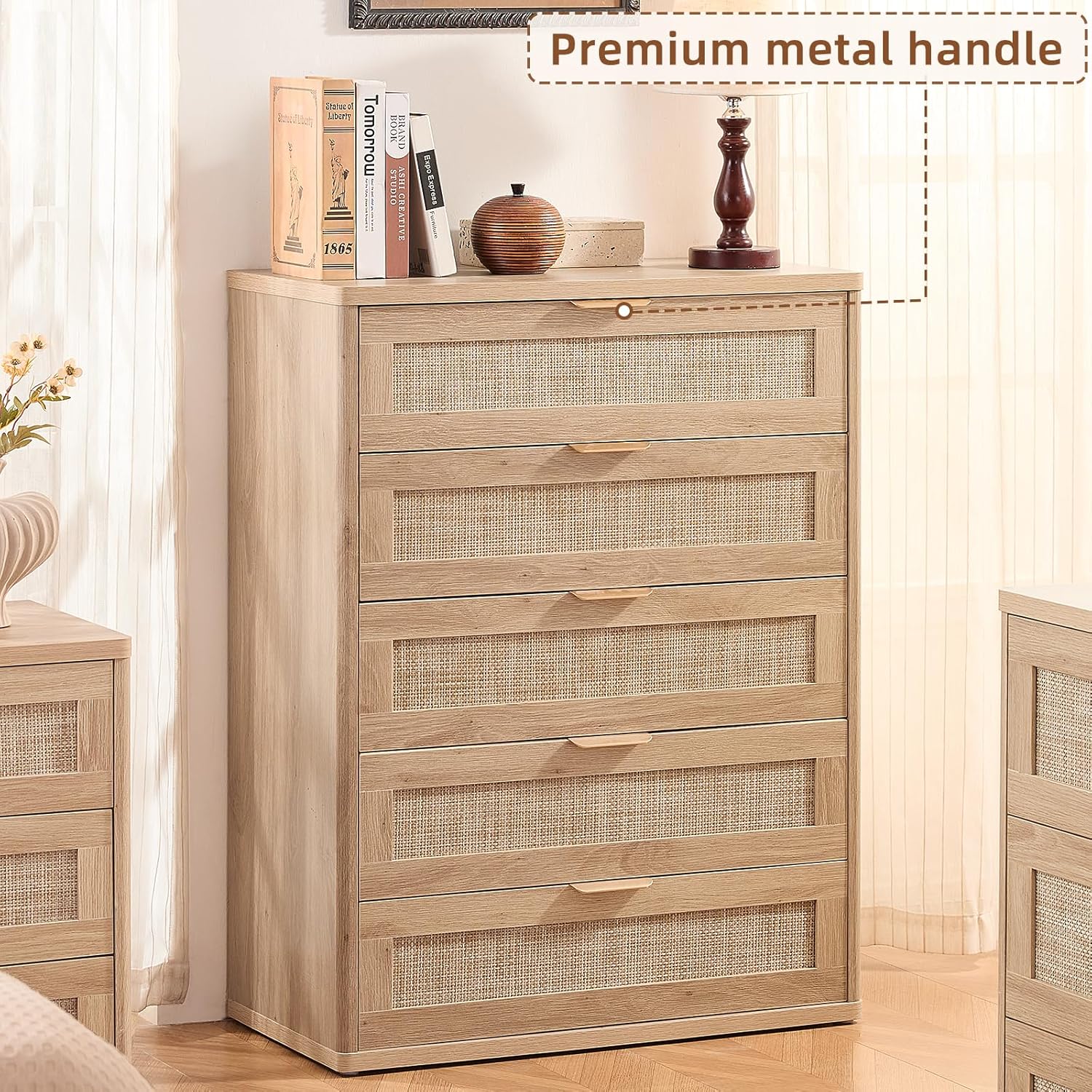 - Boho 5 Drawers Rattan Dresser for Bedroom : This 5 Drawer Wood Dresser flawless combines Boho and modern styles. The rattan-decorated drawers and natural wood grain enhance its visual appeal. This exquisite dresser for closet is available in multiple color options, easily blending into various decor styles to create a cozy home atmosphere.