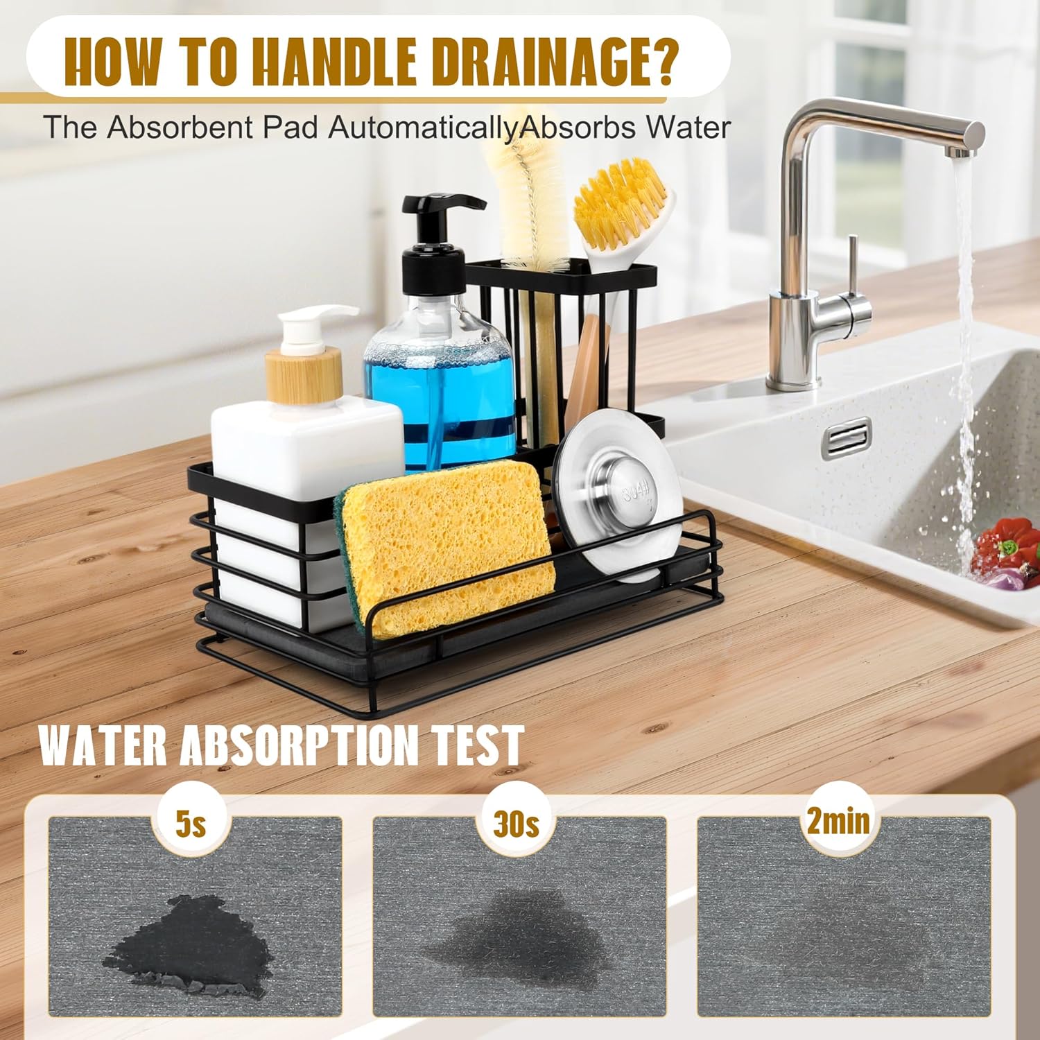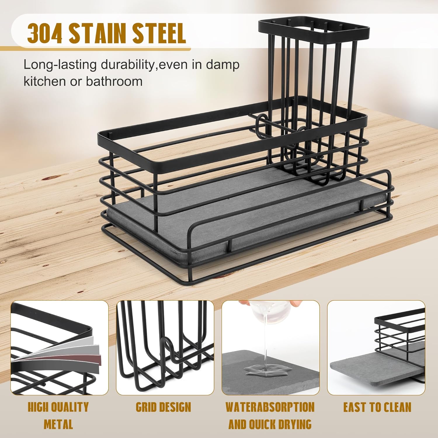 - Fast Water Absorption— The base of thissponge holder for kitchen sinkis made from naturaldiatomaceous earth, which absorbs water within 31 seconds — no more standing water or soggy sponges. Combined with a breathable hollow metal frame, it promotes fast drying and a cleaner sink space.