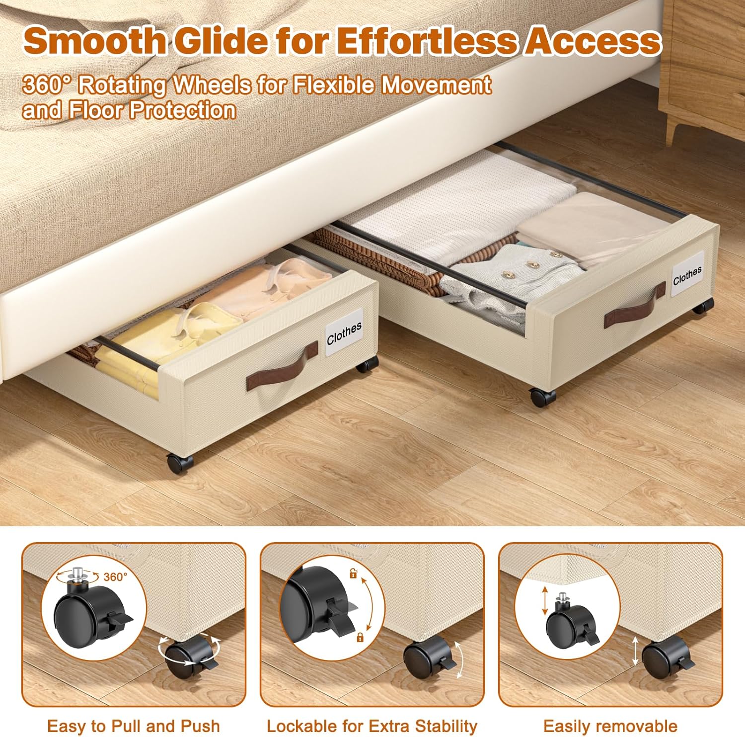 - Transparent Window & Label Design: The rolling under-bed storage bins feature transparent lid windows and label slots, making it easy to identify contents without opening multiple containers. This design helps prevent misstorage and ensures you can quickly locate items. The double zipper bottom and high-quality material keep dust, moisture, and dirt out, keeping your items clean and organized.