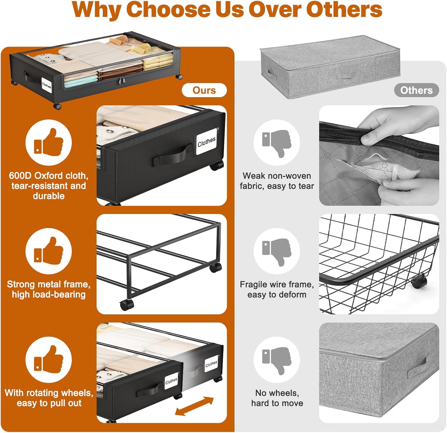 - Upgraded Large Capacity: Made of high-quality 600DPU fabric and a sturdy metal frame, this under-bed storage box can hold up to 68 lbs. It’s spacious for organizing items of various sizes, keeping everything neat and convenient. Perfect for storing clothes, shoes, books, bedding, and other essentials.