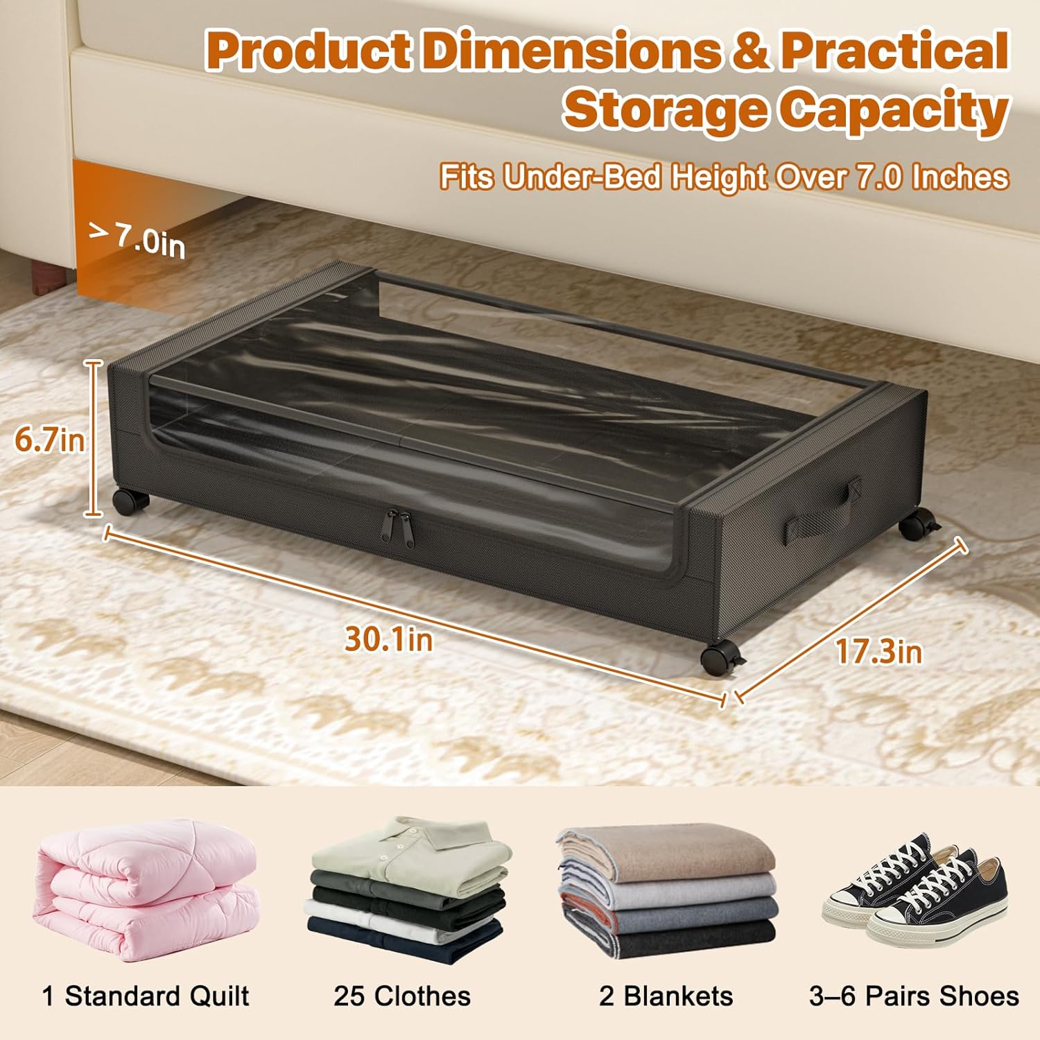 - Tough Build & Compact Design: The under-bed storage box uses a durable metal frame to withstand heavy loads while maintaining its original condition, ideal for long-term storage. The size of the storage unit is 31.5 x 17 x 6.3 inches (with wheels), suitable for under-bed heights greater than 6.9 inches. Its compact design allows it to be used under beds, sofas, shoe cabinets, tables, and closets to make the most of unused space.
