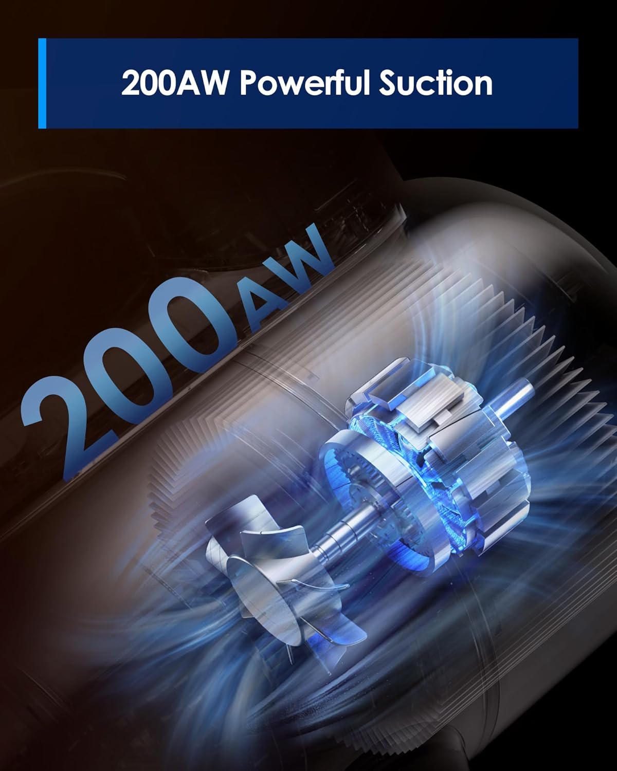 - 200AW Powerful Suction with Clogless System: Provides a 200AW suction that swiftly captures dust, debris, and pet hairs, ensuring thorough cleaning. Suitable for everyday cleaning on both carpets and hard floors