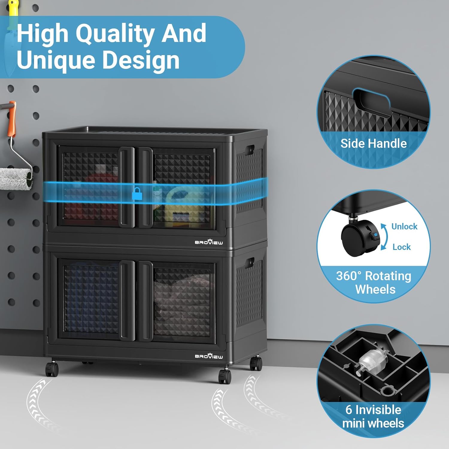 BROVIEW 120Gal Stackable Storage Bins with Lids & Wheels, 480Qt Plastic Collapsible Closet Organizer and Storage Drawers, Storage Boxes Cabinets for Home, Office, 6 Pack, Black