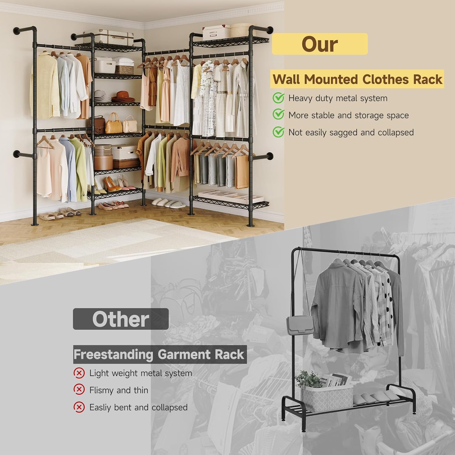 - Sturdy & Safe Construction : ONBRILL L4 garment rack built with premium matte powder coated metal pipes, this material not easy to deform to ensure durability. Wall-mounted design prevents tipping, offering better stability than freestanding racks