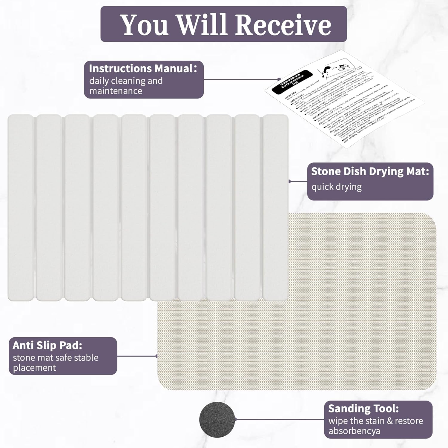 - 【Usage Tip】Avoid spilling dark liquids like coffee or red wine on your stone dish drying mat, as they may cause staining. For regular water marks, simply rinse with water and wipe with a damp cloth before air drying. For stubborn stains, gently sand the area with the included sandpaper or spot-treat with baking soda for quick restoration.