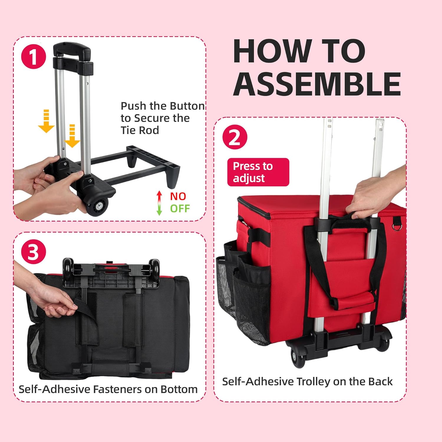 Rolling Cleaning Caddy Bag with Wheels, Large Cleaning Cart Detachable Trolley, Cleaning Bags for Housekeepers With Shoulder Strap & Multi Pockets for Cleaning Tools Storage (Red)