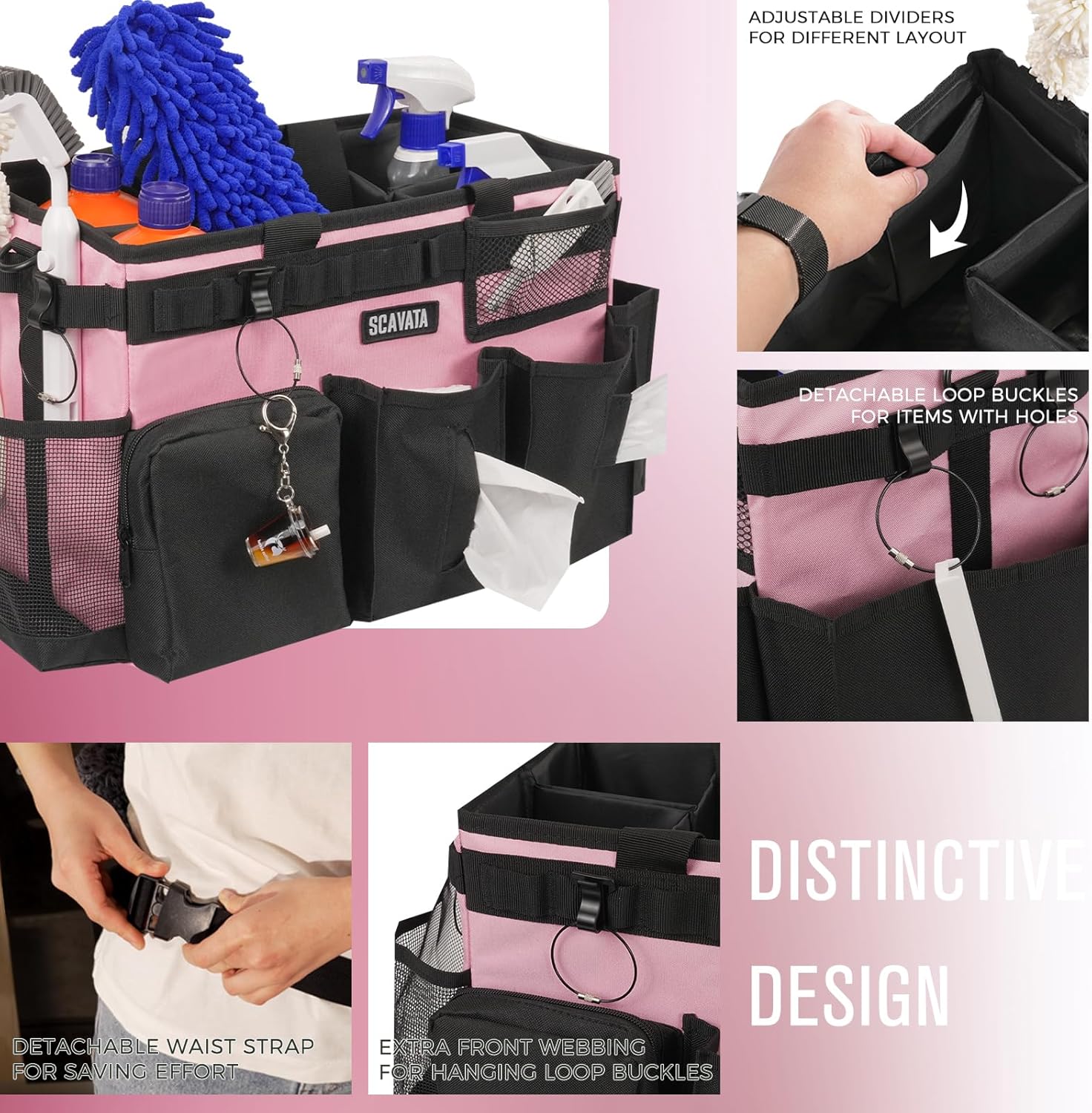 Wearable Cleaning Caddy Bag, Cleaning Caddy Supplies Organizer with Handle & Shoulder Straps for Housekeepers, Under Sink & Car Cleaning Tool Organizers with 4 Foldable Divider (SweetPink)