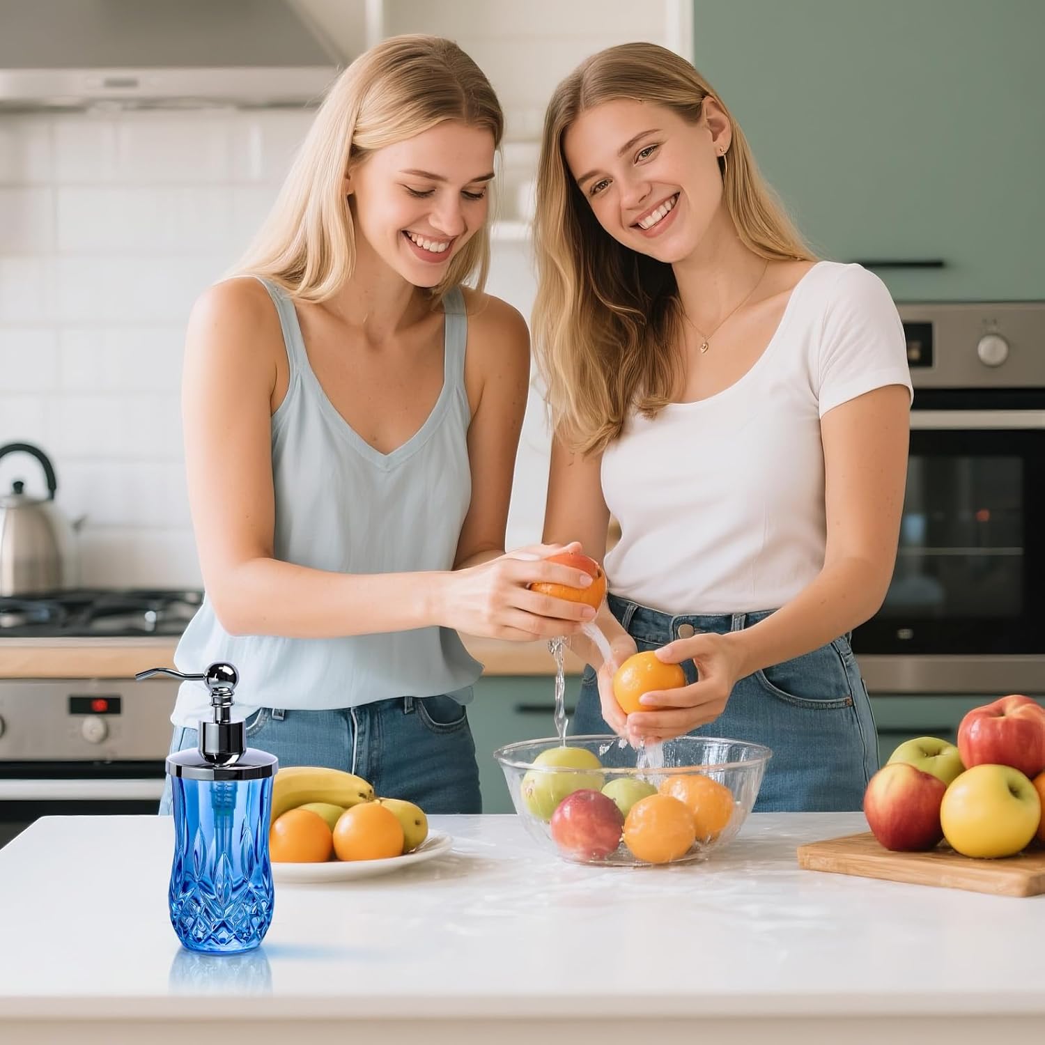 9Oz Diamond Grid Pattern Blue Glass Soap Dispenser with Rust Proof Stainless Steel Pump,Refillable Liquid Soap Dispenser for Bathroom & Kitchen Dish Soap, Hand soap, Lotion(Round)