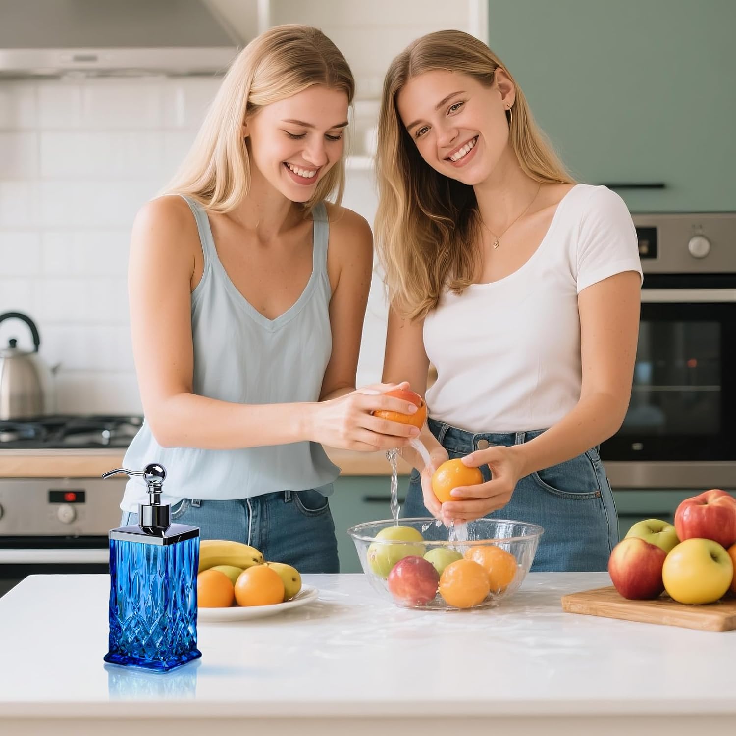 10Oz Diamond Grid Pattern Blue Glass Soap Dispenser with Rust Proof Stainless Steel Pump,Refillable Hand Soap Dispenser for Bathroom & Kitchen Hand Soap,Lotion,Body Wash(Square)