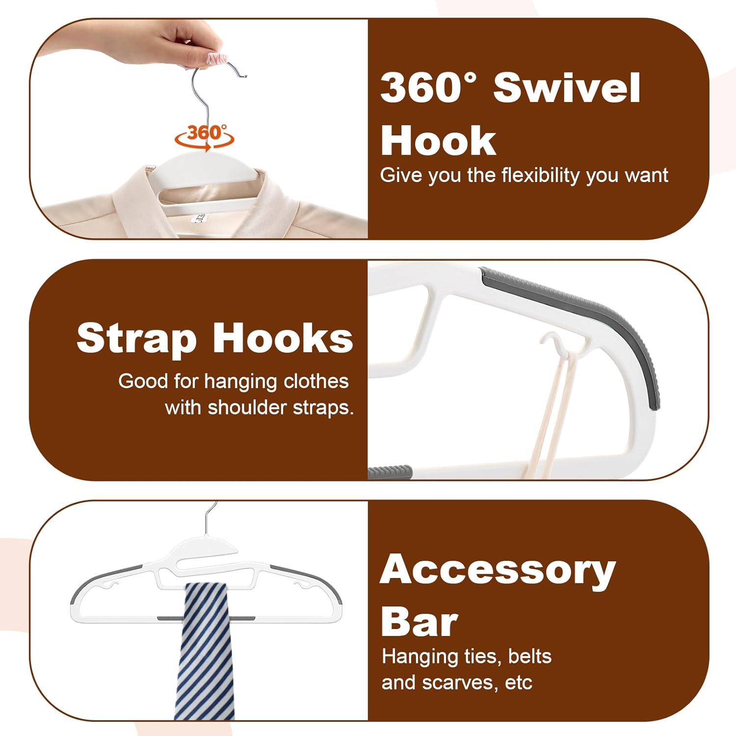 - S-shape Opening Design - S-shaped opening design make you can hang and take down clothes effortlessly and protects clothes collar from deformation. The central bar is great for hanging ties, scarves, belt or other accessories. The side hooks are perfect for hanging strappy clothes