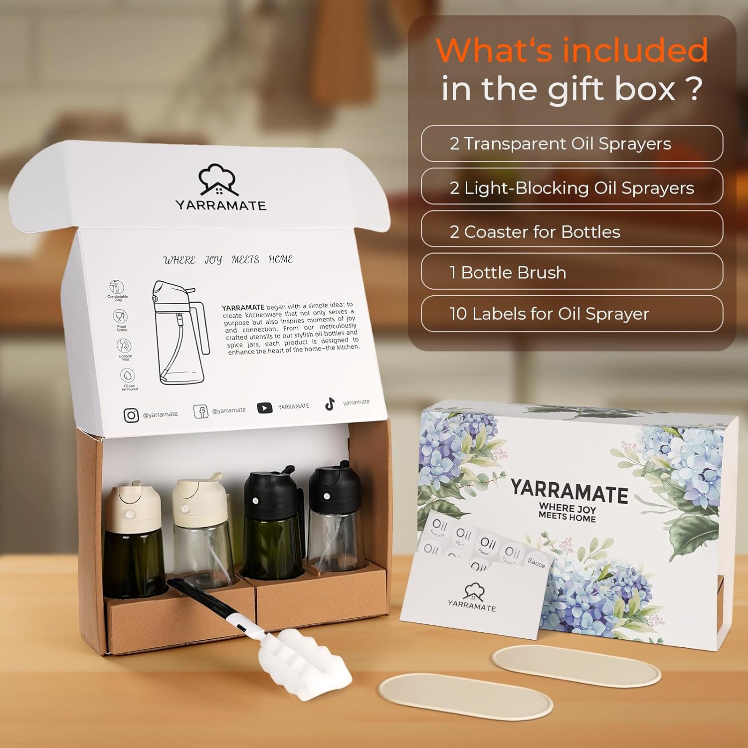 - 【Gift-Worthy Complete Set】This premium Olive Oil Sprayer Gift Kit includes 2 clear 16oz/470ml glass sprayers, 2 dark glass 16oz/470ml sprayers, a set of customizable stickers, 2 non-slip bottle mats, and a cleaning brush — Whether it's for a celebration, housewarming, or simply to elevate everyday cooking, it's a gift that combines style and function