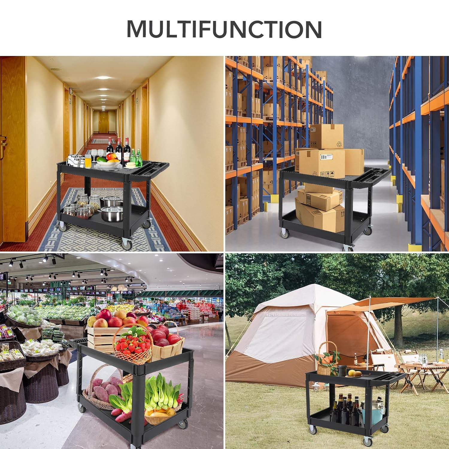 - 🎁EASY MANEUVERABILITY - Ergonomically designed push cart handle provides optimum hand placement and push height improving control and worker safety. Compact design makes navigating restaurant tables, warehouse shelves, and back-of-house facilities easy.