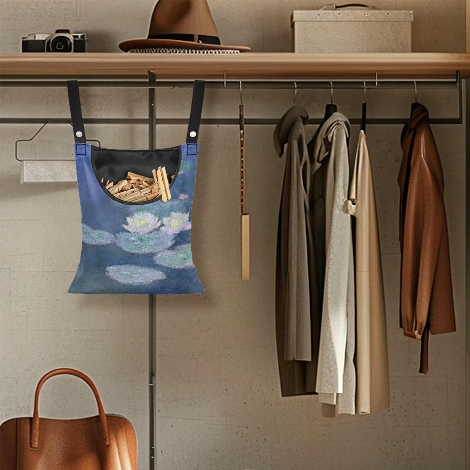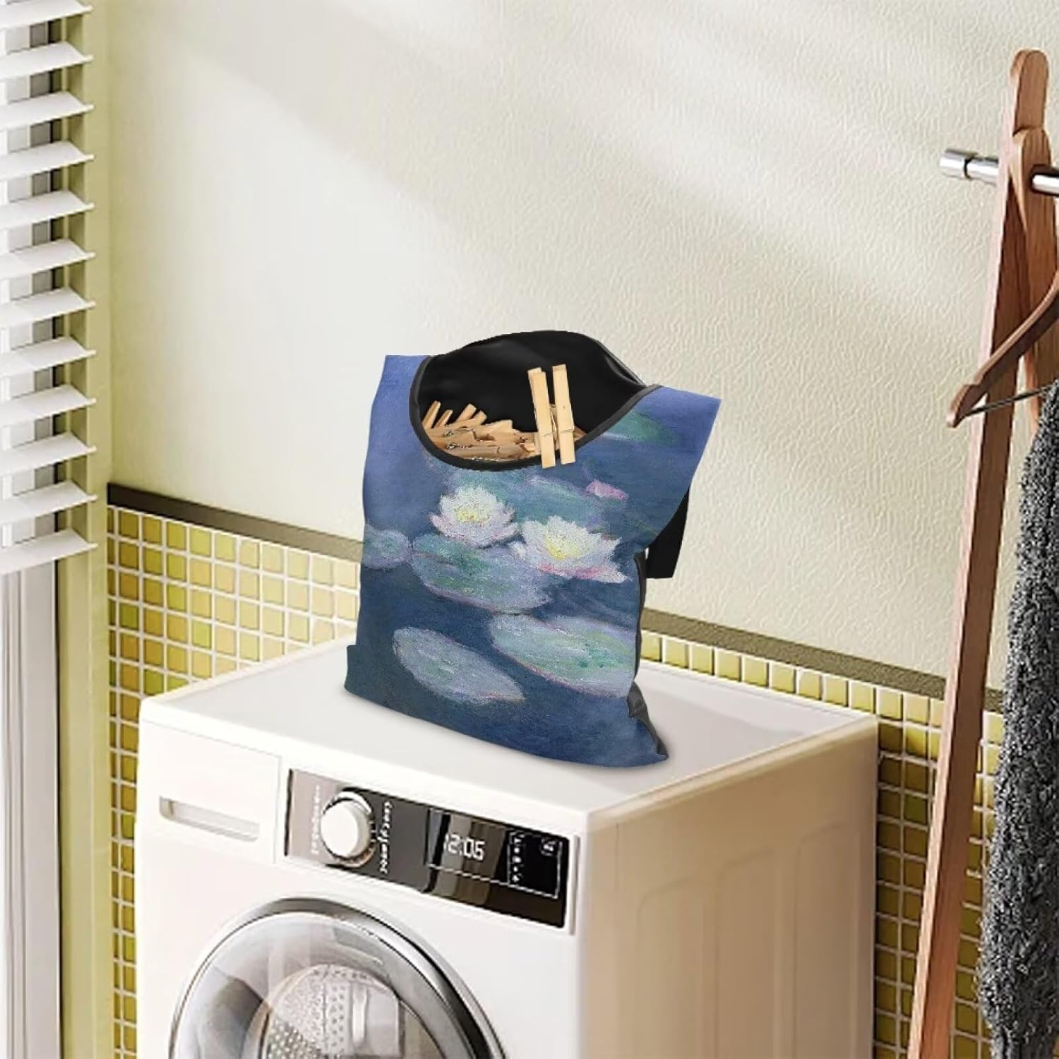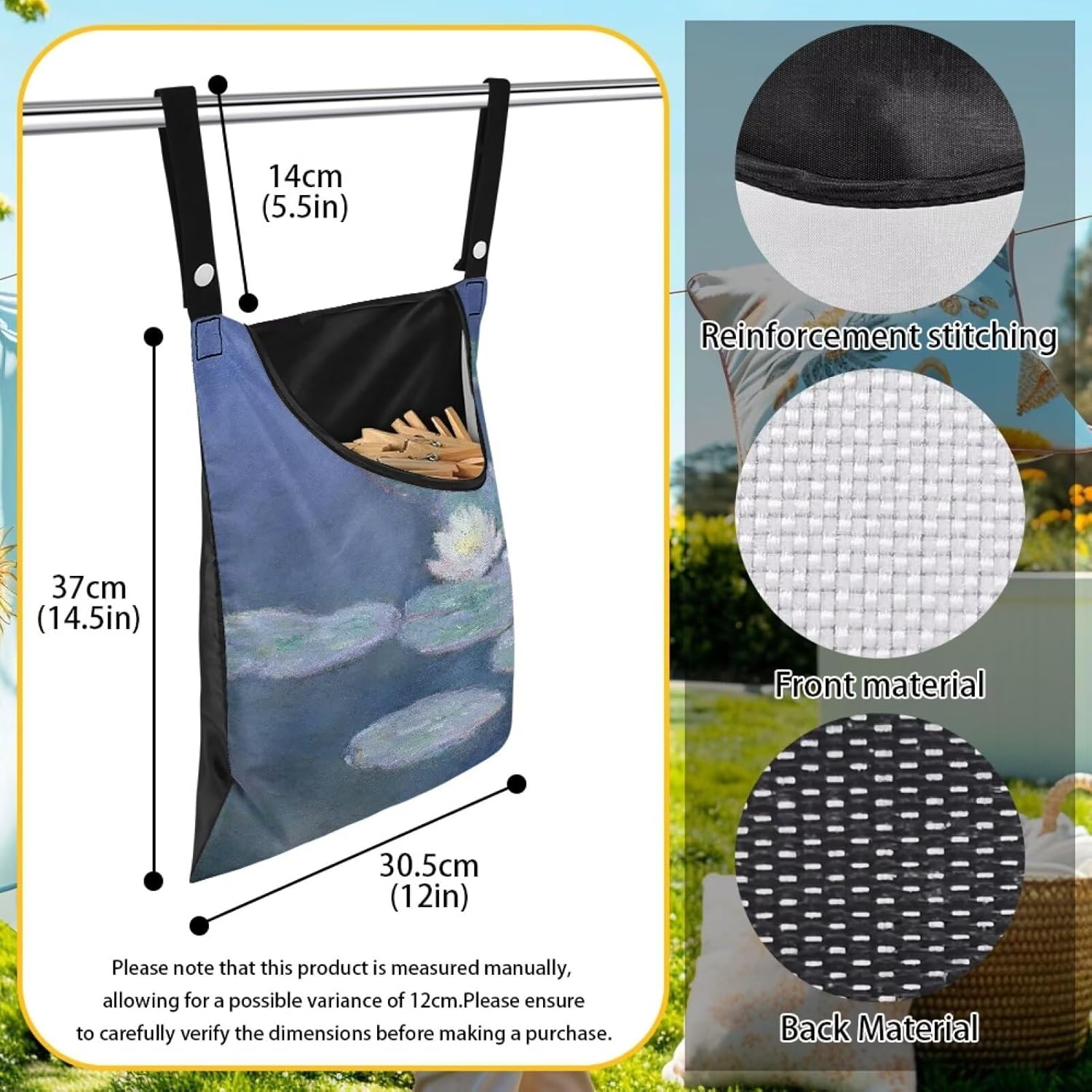 Outdoor Clothespin Storage Bag with Windproof Design - Monet Water Lilies Print Heavy Duty Polyester Hanging Organizer Pouch for Clothesline Pins - Large 14.5"x12" with Hanging Loop