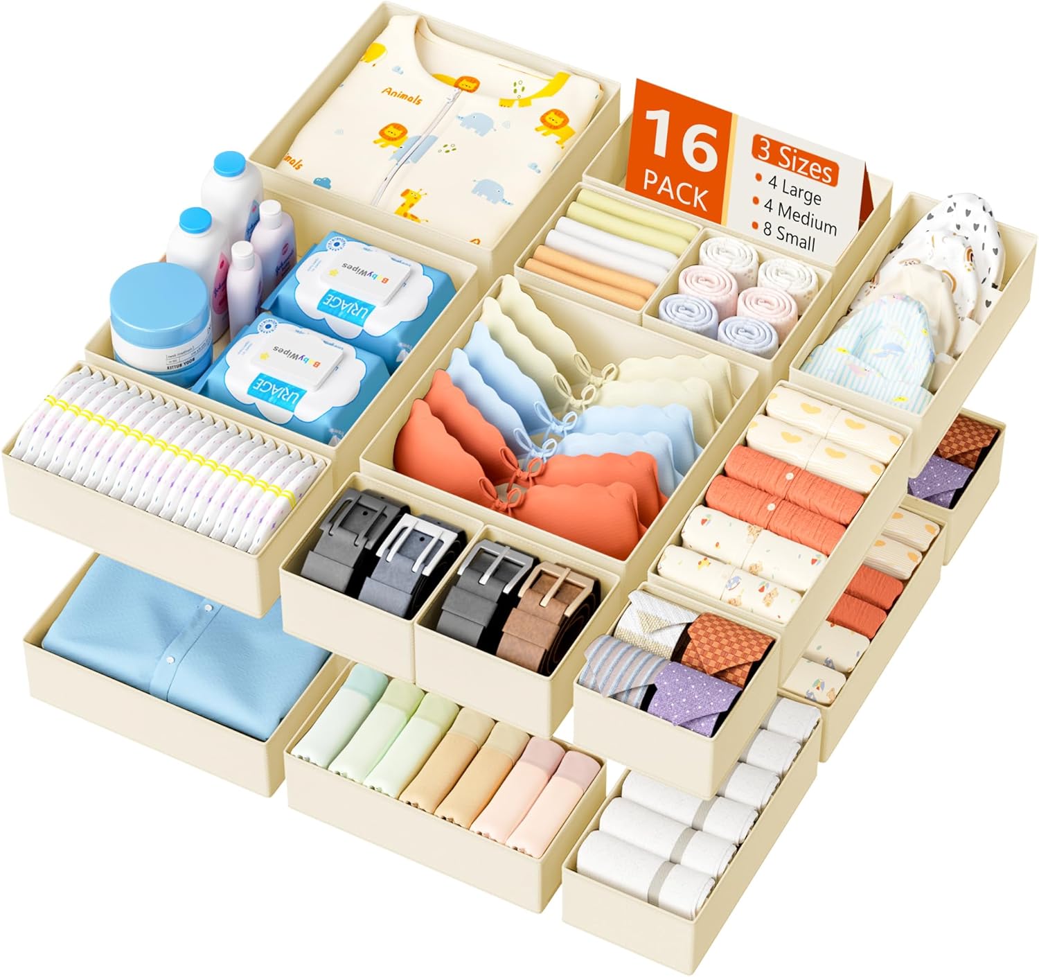 DIMJ Drawer Organizer Clothes - 16 Pack Baby Dresser Organizer for Nursery, Foldable Drawer Organizer Bins for Closet Bedroom Organization, Fabric Clothes Storage Dividers for Underwears, Socks, Bras