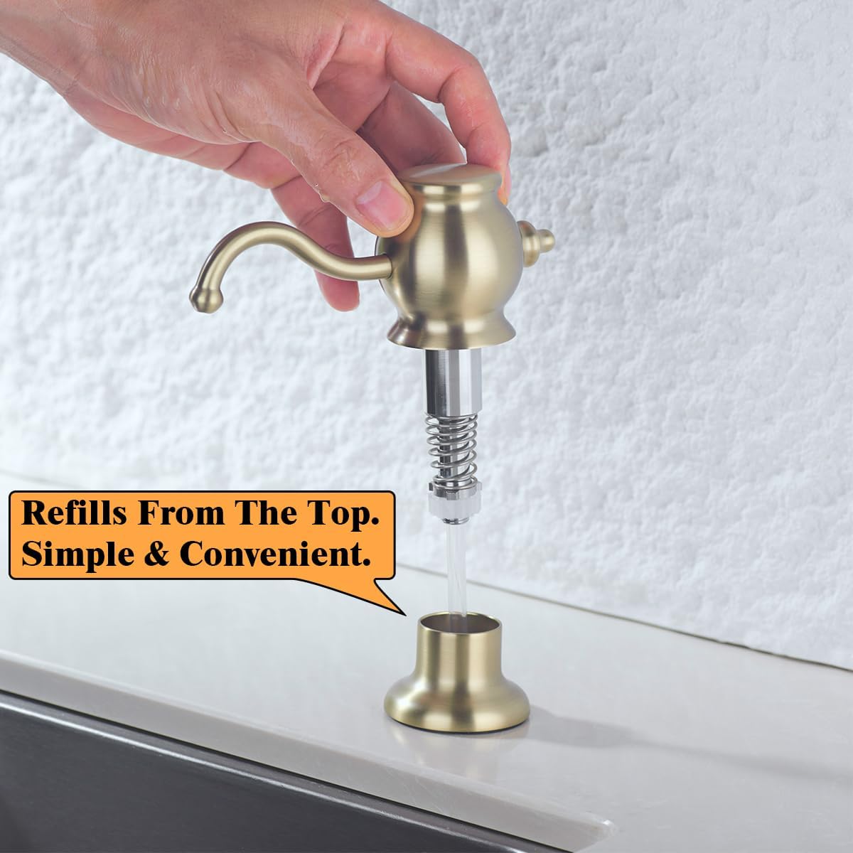 - Refills From The Top: No need to refill under the sink. Just refill the soap directly from the top. Simple and convenient. Added to your kitchen sink and it is a great space saver