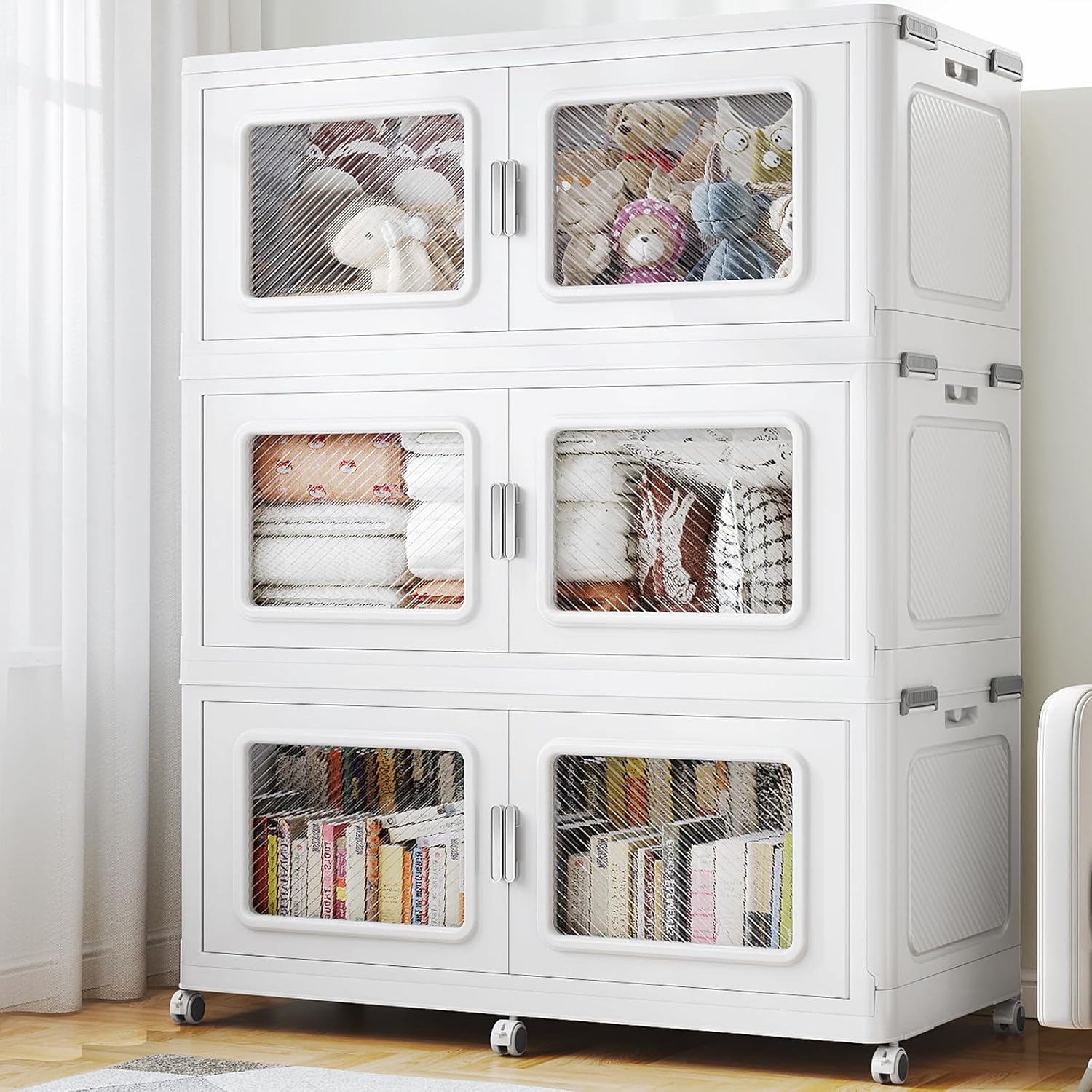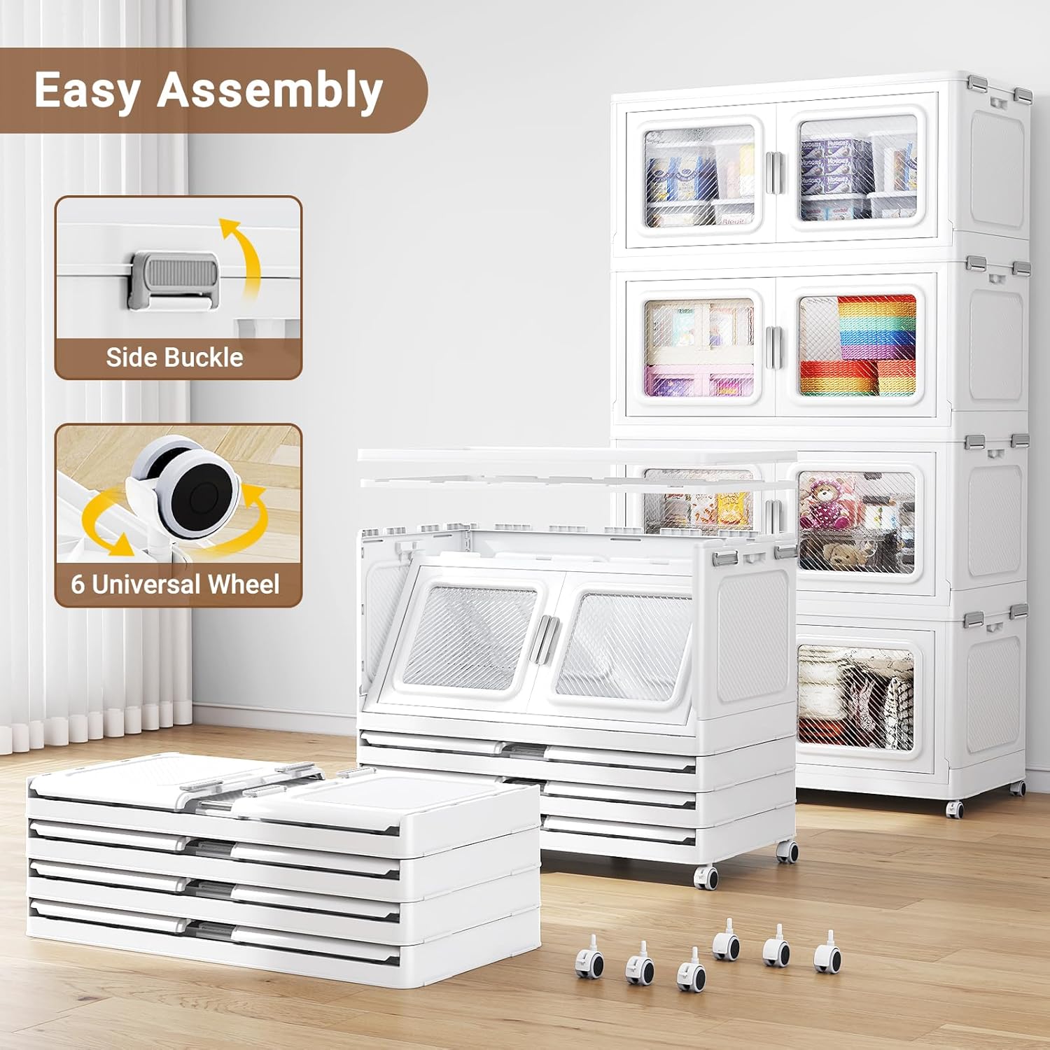 - ăStackable Design & 360° Rotating WheelsăOur stackable storage bins with wheels design enables secure multi-layer stacking, reinforced by double side 2-buckles and 1 rear buckle for stability. Heavy-duty storage cabinet equipped with 6 TPR-coated 360° swivel wheels for effortless mobility, keeping spaces tidy and organized