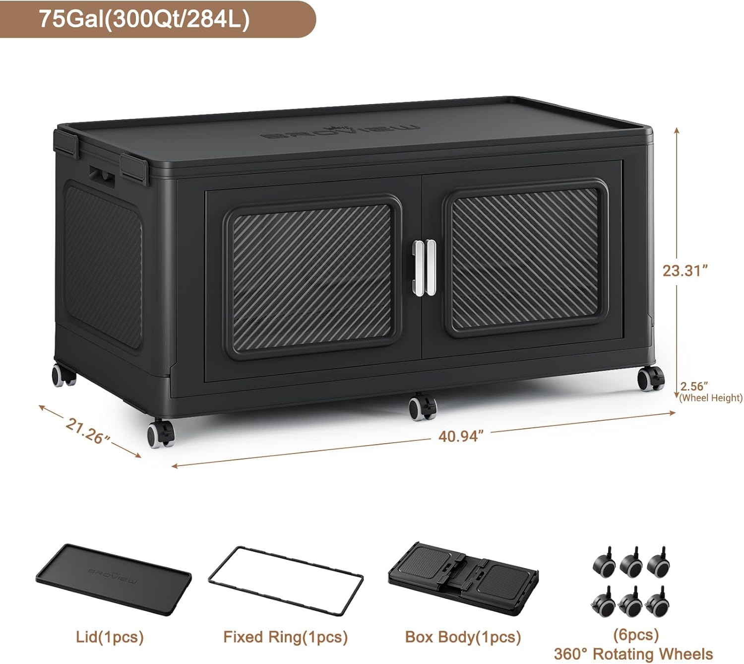 - 【Extra Large Storage Bin】75 Gal (300 QT) * 1 Pack. Dimensions: 40.94"(L) x 21.26"(W) x 23.31"(H) | Interior: 38.46"(L) x 18.82"(W) x 19.17"(H). The plastic storage bins featuring a 6.04 ft² bottom area and 1.94 ft height, ideal for maximizing large-space storage in bedrooms, garages, or closets. (Note: For indoor use only)