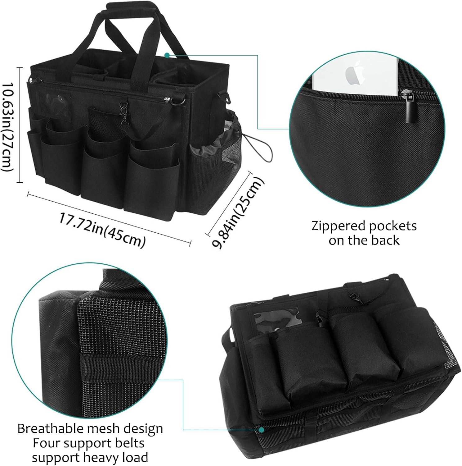 - Large Capacity: Bathroom cleaning caddy size: 17.7 x 10.6 x 9.8 Inches (Approx. 45 x 27 x 25 cm). 11 exterior pockets for all cleaning supplies, such as cleaners, bottles, sprays, dusters, cloths, gloves. A small lifting loop on the front holds keys or brushes, and there is a clear slot for your business cards. Back zip pocket for your wallet, mobile phone, credit cards. 2 removable internal dividers provide 5 storage compartments to keep your different tools upright in an organised manner