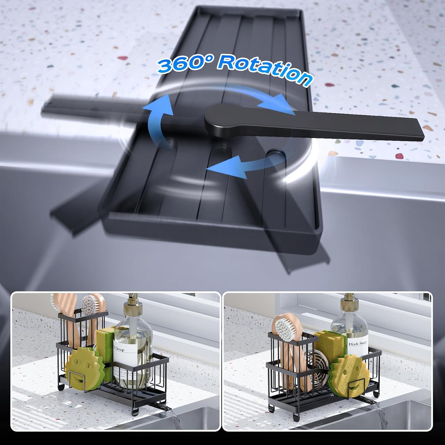 - 『360°Rotatable Drainage & Quick Dry』This innovative kitchen sink caddie adopts hollow out design is equipped with a 360°rotating port that allows the water collected in the plastic dish to flow directly into the sink from any Angle, reducing the time and frequency of cleaning the sponge holder, reducing unnecessary work, and improving the happiness of using the kitchen.