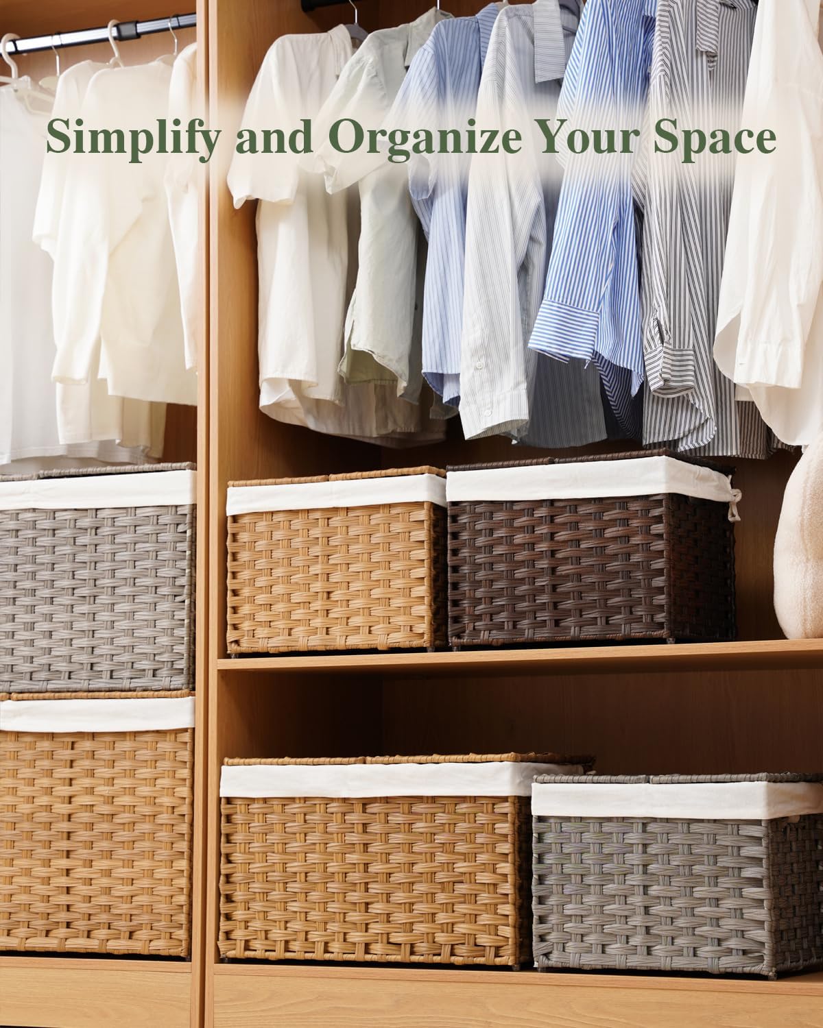 Storage Basket with Lid Woven Wicker Baskets with 2 Separate Lid, 9.2 Gallon (35 L) Wicker Storage Bins with Handles, Foldable and 2 Removable Liner Bags for Bedroom, Laundry Room Natural