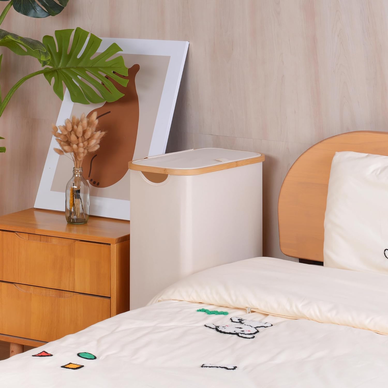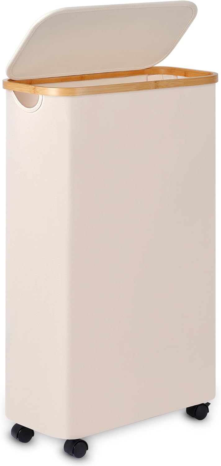 Slim Laundry Basket with Wheels,Narrow Hampers for Laundry,Freestanding Laundry Hamper with Lid&Bamboo Handles,Collapsible & Waterproof Tall Cloth Hamper for Dorm Family(60L Beige)