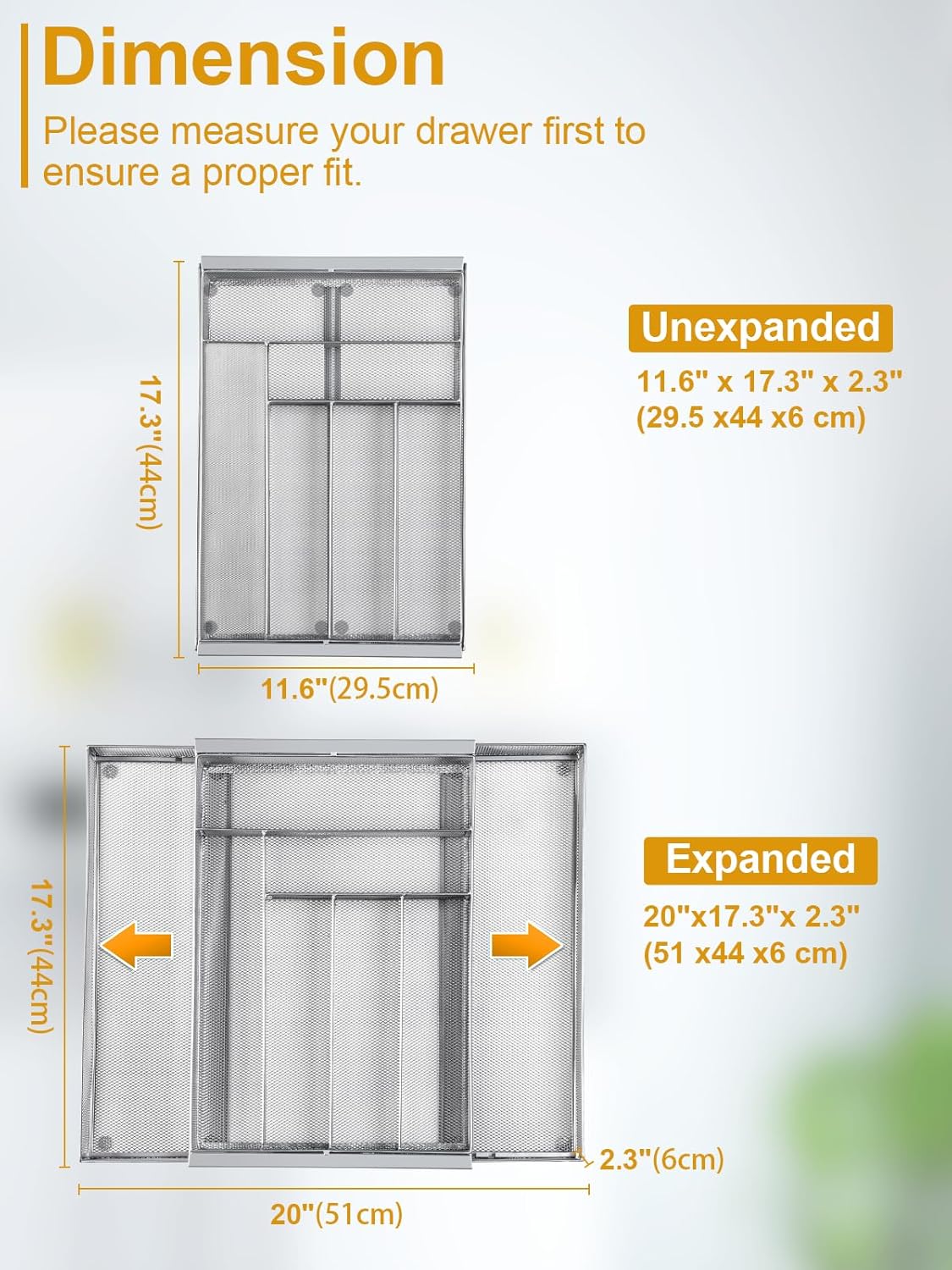 - Expandable Design: This Expandable Drawer Organizer Easily Adjusts From 5 to 7 Compartments, with a Width That Expands From 11.6" to 20". It Saves Space While Fitting All Your Kitchen Essentials with Ease.