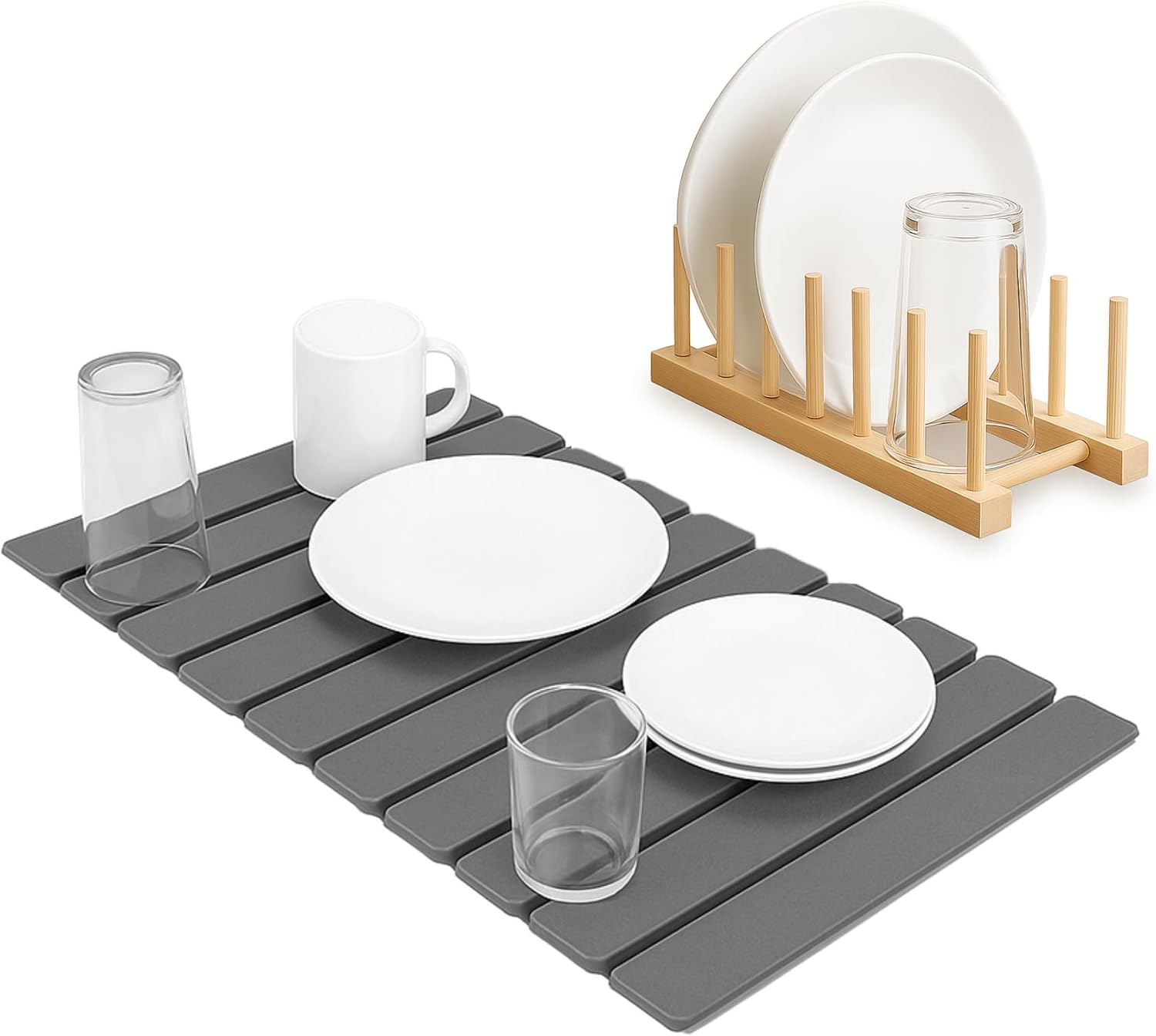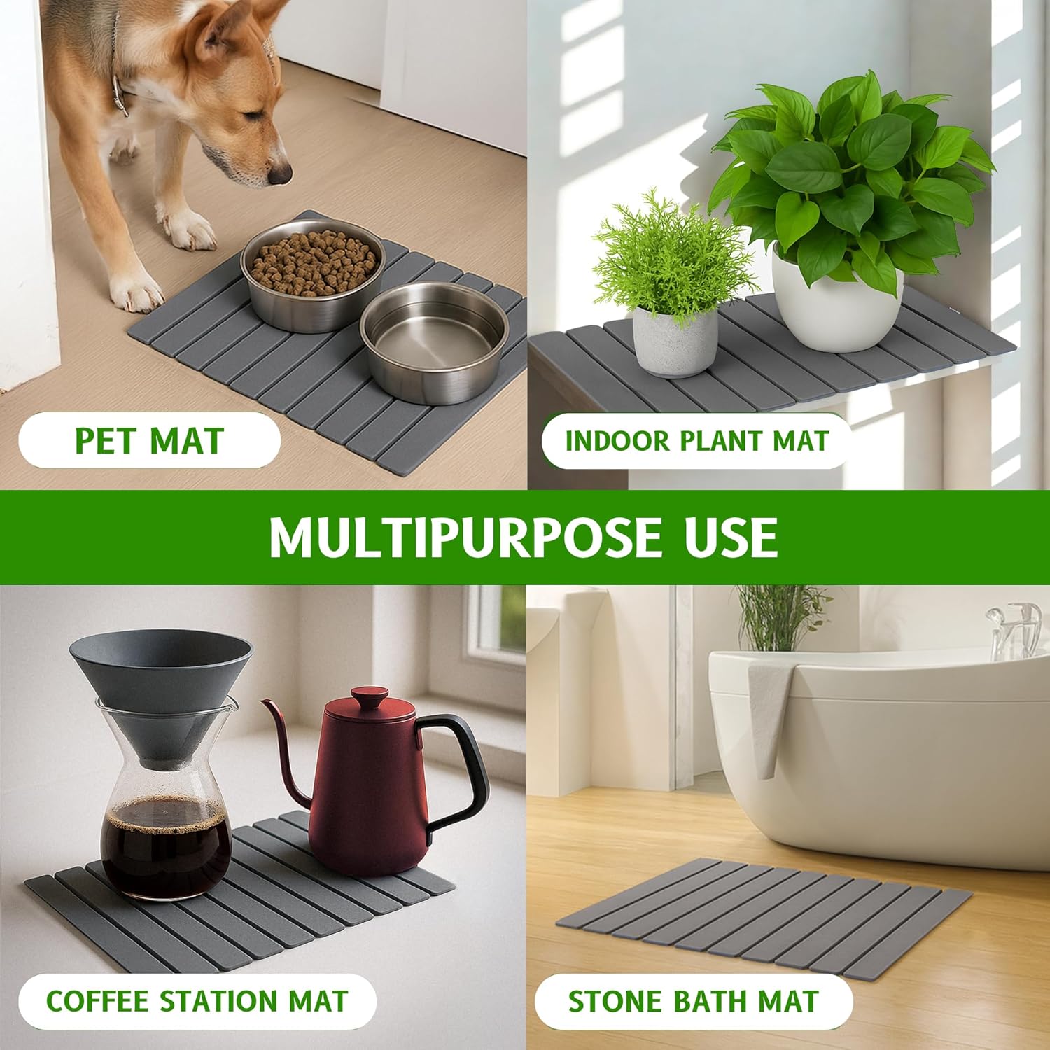 - [Super Absorbent & Quick Drying – Hygienic Countertops] Crafted from natural diatomaceous earth, this stone drying mat instantly absorbs water and dries in minutes. Curved grooves improve airflow, prevent pooling, and keep counters fresh, odor-free, and hygienic.