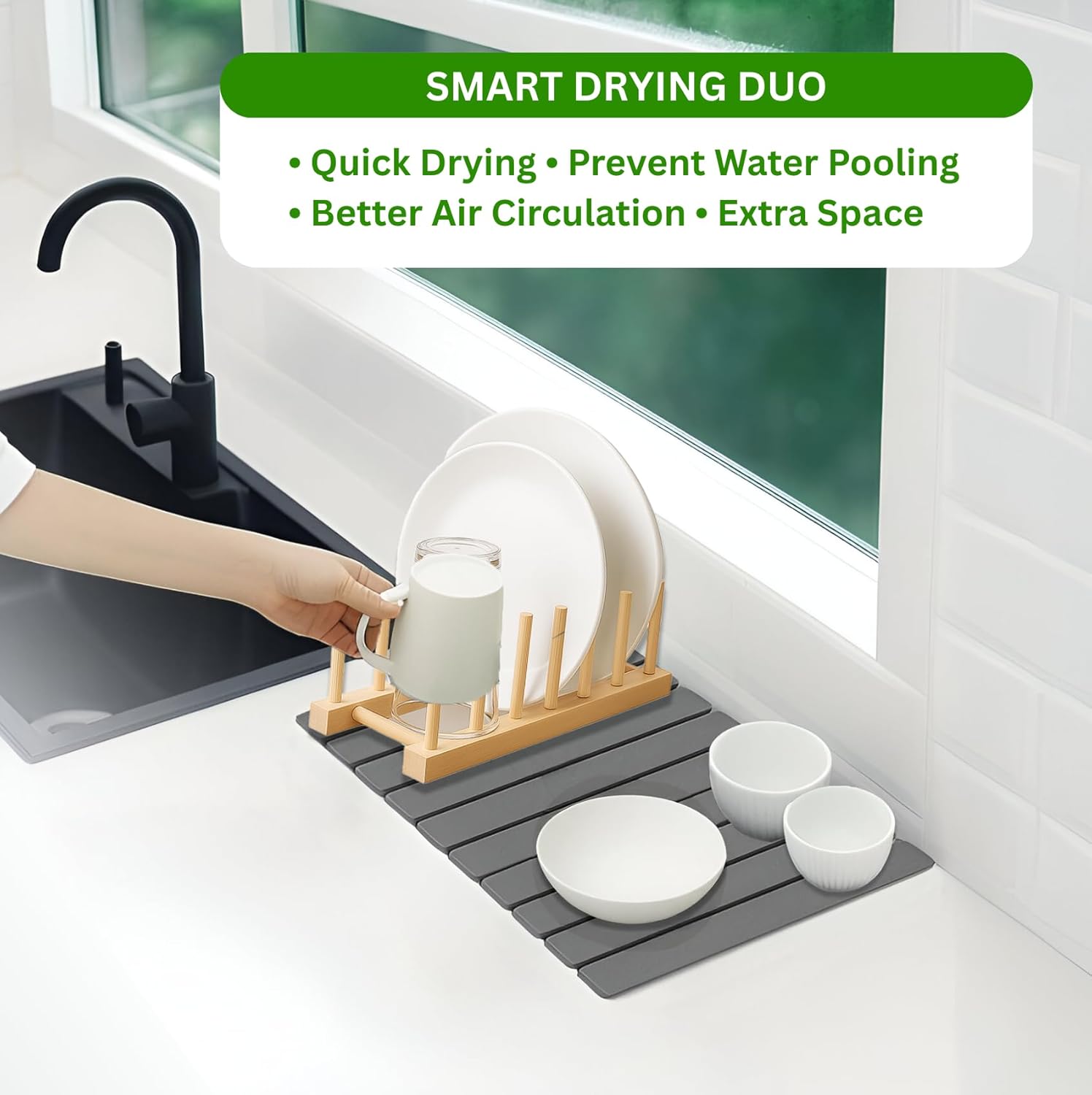 - [Large 24" × 16" Multipurpose Mat – Foldable & Space-Saving] Generously sized to hold dishes, pans, and utensils, yet foldable and compact for easy storage. Beyond the kitchen, use it as a bath mat, heat-resistant trivet, plant saucer, or pet feeding mat.