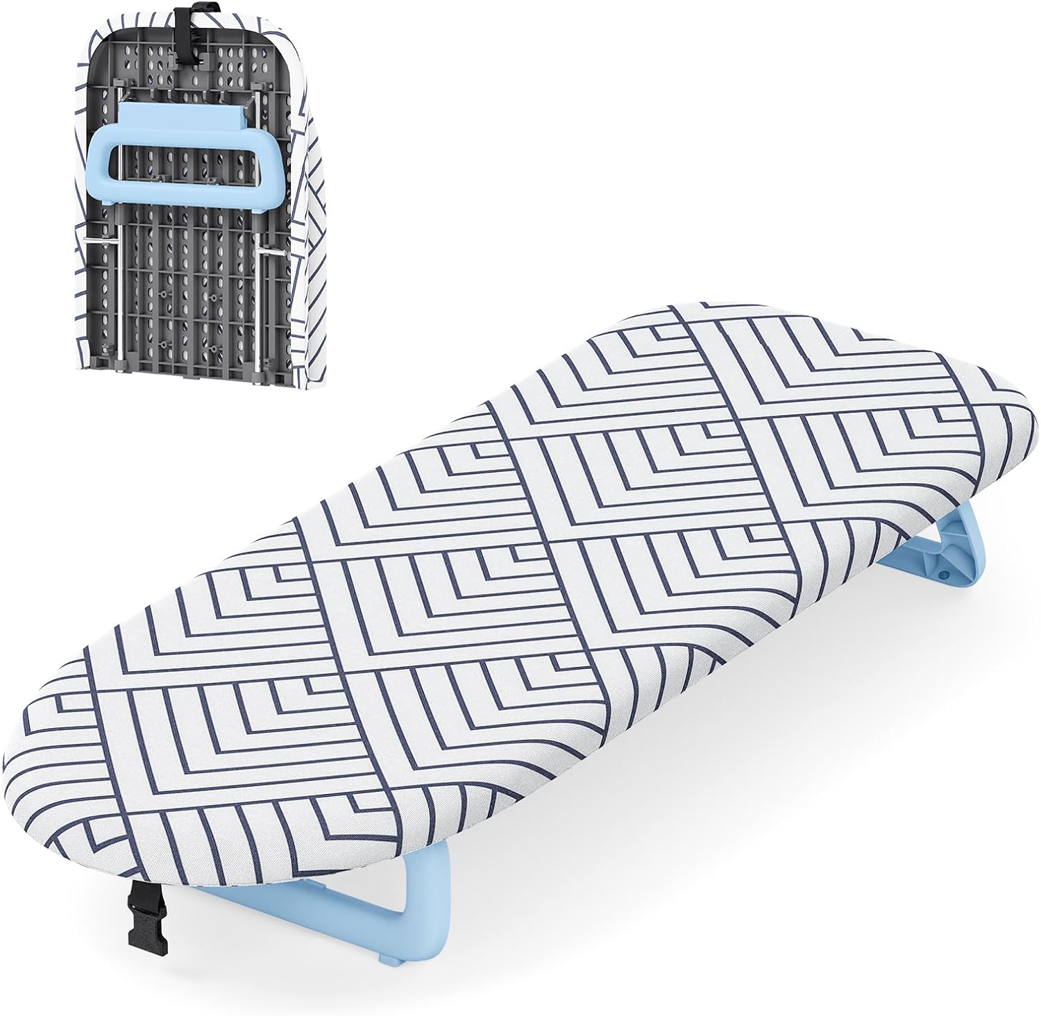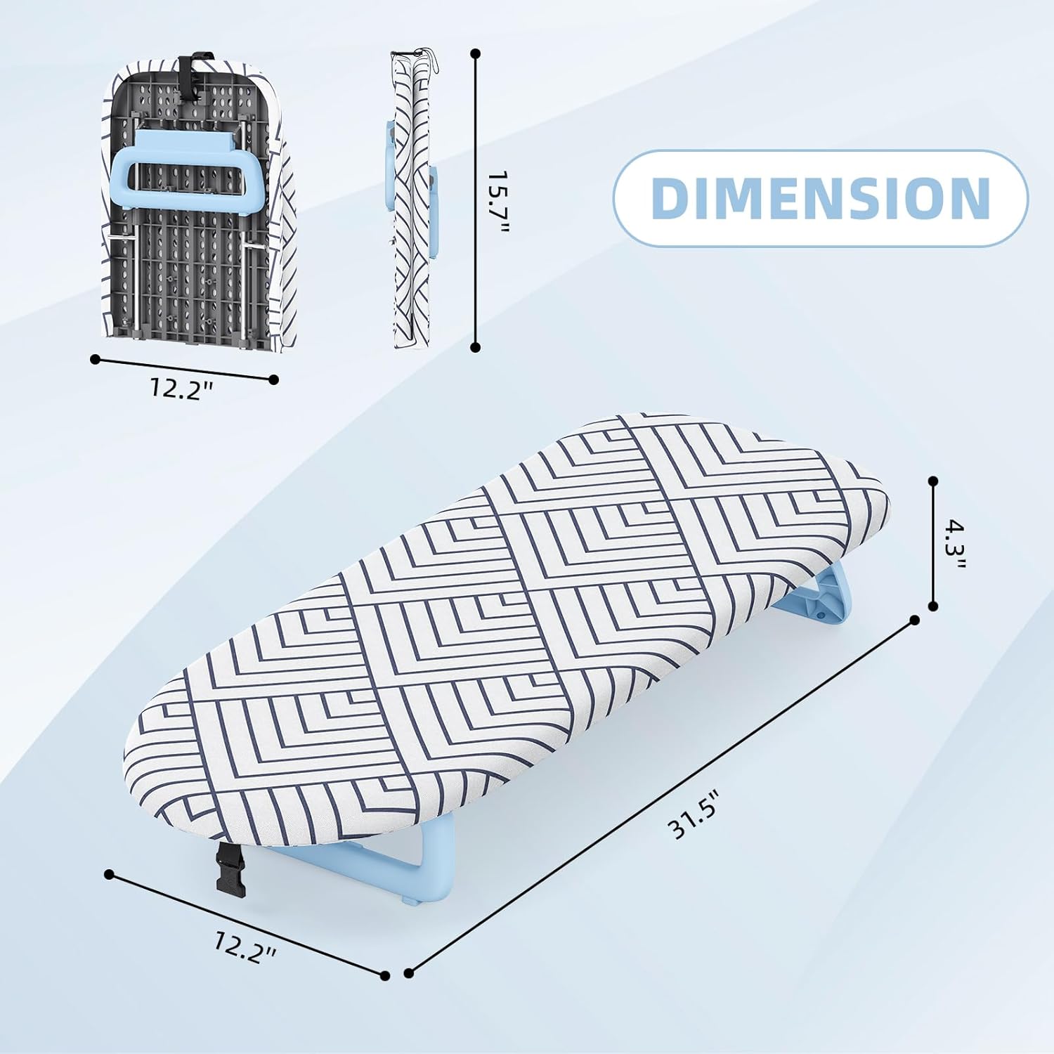 - [Foldable & Space Saving Design]This small ironing board folds effortlessly for compact storage. After folding, the table top ironing board measures 32"x12" and only 2 inches in thickness, ideal for most small places.