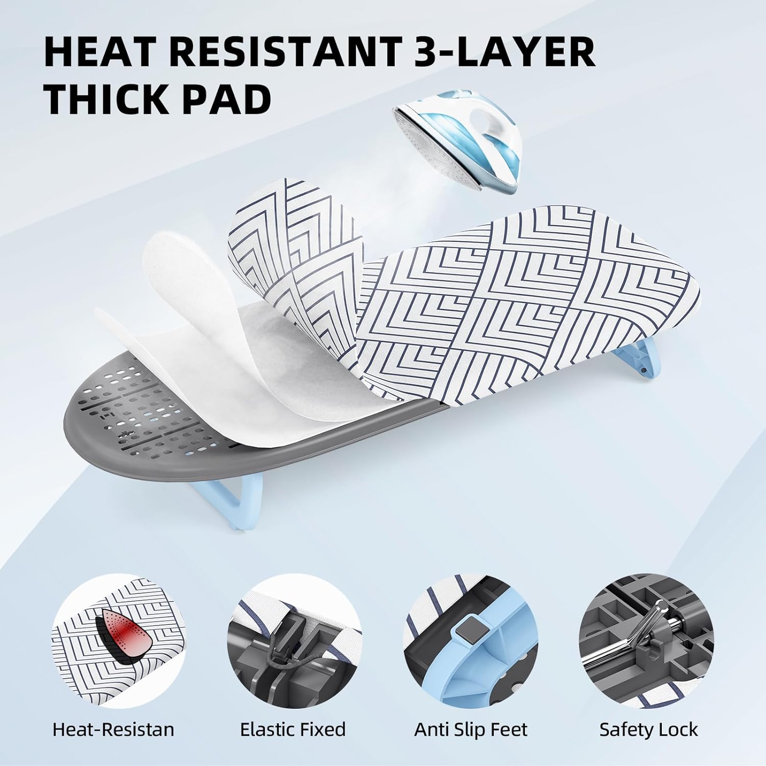 - [Fashionable and Sturdy] With anti-slip feet and safety lock, the small foldable table top iron board provides amazing stability during ironing. In addition, the unique feet design brings a modern and fashionable appearance for our mini ironing board.